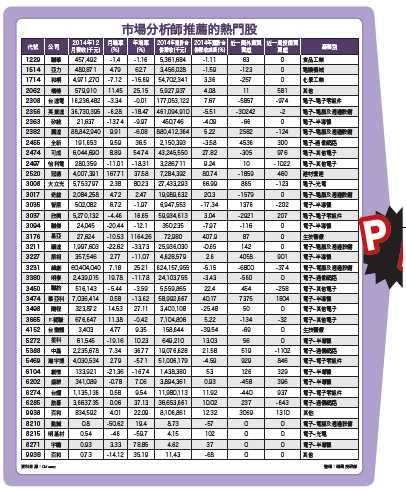 市場追逐標的繁雜 籌碼、財報重重挑戰本周市場分析師所叫進的個股,看來還是以電子族群股為主,而所屬次產業則主要散見於半導體、通訊網路、電子零組件、電腦及周邊設備等族群為叫進方向。上周分析師叫進非電子類股標的,大多側重於食品、電機機械、化工、生技醫療、營建、其他類等族群股,個股產業涵括範圍廣泛而繁雜,並無一致性。另外一方面,從市場外資及投信法人近期的買賣超動作來看,不少標的近期是遭外資、投信砍殺,如:英業達(2356)、緯創(3231)、台達電(2308)、冠德(2520)、奇鋐(3017)、中磊(5388)、怡利電(2497)、啟碁(6285)、聯鈞(3450)等個股,這些有法人賣壓的個股,股價後市因為籌碼凌亂將平添許多變數。再從財報分析角度來看分析師叫進的個股,近期所公布去年十二月營收、去年全年營收與前一年相比,年增率表現較差的個股有:英業達、聯傑(3094)、明泰(3380)、矽統(2363)、瀚宇博(5469)、智原(3035)、聯華(1229)等,這些標的仍是市場分析師叫會員買進的口袋名單,按財報面選股邏輯檢驗,基本面有變化應保守觀望,不必積極搶買!