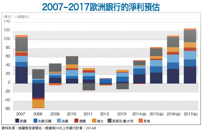 莊凱倫推估歐洲央行可能在第一季的一月二十二日後,便推出類似美版QE政策,藉此刺激景氣活絡並預防歐元陷入通縮窘境;而美國景氣穩健復甦,將有助增加歐洲企業營收,且油價走低與歐元貶值亦有利歐洲企業降低成本與獲利成長,加上歐股本益比仍處於低水準,因而無論從基本面、資金面及價值面而言,二○一五年歐股在利多匯聚下,成長潛力十足。她建議投資人可以著眼股性活潑、具爆發力的歐洲中小型股票基金,是為布局歐洲股市首選。歐股本益比約十六倍貝特曼則認為,在獲利方面,銀行業是他們研究團隊看到有顯著改善的成長潛力,預期歐洲銀行將會和美國一樣,受惠於景氣復甦,帶動其獲利回升。在未來三到五年內,歐洲銀行的獲利將大幅成長,這對銀行業的淨利具有明顯且積極的影響。此外,目前股價水準也顯示歐洲股市仍然是一個具有投資吸引力的區域。根據循環週期調整後的泛歐洲股市本益比大約是在十六倍左右,相對於過去三十年的二○.八倍之平均值來看,當前美國股市為二十七倍,因此對於投資人而言,歐股是一個非常值得注意的投資機會。