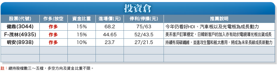 國際股匯市風起雲湧,包括歐洲國家無預警降息、國際油價持續走低、美元升值持續高檔震盪;展望本周後市,諸多變數亦影響台股短期走勢,如瑞士法郎大漲、歐洲央行(ECB)會議、希臘選舉等。倒是財政部長張盛和表示,台灣經濟溫和成長,應該審慎樂觀,正面看待台股。農曆年前剩下最後十幾個交易日,市場預期,台股進入盤整區間,何時出現攻擊量,股價才有表態機會。部分資金選擇在年前獲利了結,因為漲多要拉回,待農曆年後假期結束再來操作。目前每日都有不確定因素在,將是個股操作大盤盤整居多;至於中小型各股上沖下洗的走勢,心臟要夠強,才能進場廝殺。健鼎(3044):印刷電路板廠,今年營運緩步成長,今年仍看好HDI、汽車板及光電板為成長動力,並持續針對湖北新廠擴產,提振營運向上空間。F-茂林(4935):導光板大廠,包括家電、照明(以平板燈為主)、車用等其他應用比重約二成內。原本生產基地位於中壢及中國大陸蘇州、中山,去年在苗栗銅鑼增建新廠,預計新產能在今年第三季將完工投產,預估屆時總產能可提升三成左右。今年首季受到農曆春節假期影響,一、二月營收可能轉淡,但三月可望回升。整體第一季營收可能維持十五~十六億元水準、季減估一成內。隨著淡季過去,第二季到第三季有機會逐步加溫。