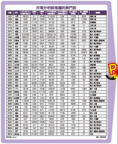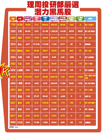 四天急攻300點,元月行情點火衝關,理周投研部從各項數據中精選八檔「鏢」股,讓讀者在聽遍市場明牌之後,能冷靜做最明智的抉擇。台股在上一個交易周內,由於受到歐洲央行宣布施行QE(貨幣寬鬆政策),且運用資金撒錢的額度,也超出市場人士原本所預期,因此造成歐美股市聞訊之後同步大漲以紅盤作收,也順利推升大盤指數在短短的四個交易日內,自低點九一七七點,急攻大漲至波段高點九四七七點,短線累計上漲三○○點、三.二七%漲幅!再度見到如同去(二○一四)年十二月中旬所展開的短線一波持續衝高上漲,最多達五一二點、五.八%漲幅的強攻力道與強勁漲勢。本周理周投研部選股的邏輯與挑股方向,也因應市場短線氣氛轉趨積極強攻格局,將選股重心放在為讀者預先篩選出,市場法人、主力、實戶、大股東鎖定,欲推升股價衝刺農曆年前大漲行情、強勢變現的標的,預料後市股價有機會在市場力量的挹注、力拱下走揚大漲,順利演出完美封關行情。八檔「鏢」股 財報績優 吸引買盤我們透過最新公布財報數字分析、獲利能力強弱研判、法人鎖定加碼力道強度分析、市場籌碼歸屬方向釐清等重要選股程序,層層篩選、精挑細選出市場資金轉向、青睞、按讚潛力漲升「鏢」股,主要可粗分為:電子、傳產類股;再細分出次產業族群分類,主要可歸類為:半導體、光電、通信網路、資訊服務、電子零組件、電腦及週邊設備、電機機械、橡膠、油電燃氣等次產業族群股。本周理周投研部所精選出標的個股中,財報數字表現優異、有利市場「主力」趁勢力拱、師出有名的標的有:晉泰(6221)、富強(5102)、雷科(6207)、其陽(3564)、揚明光(3504)、光洋科(1785)、台聯電(4905)、彬台(3379)等個股。市場籌碼歸屬方向分析方面,在我們所選出標的個股之中,市場外資及投信法人近期較為看好,鎖定與買超力道較強勁,加碼態度較積極的標的股有:揚明光、台聯電、雷科等個股。揚明光、台聯電、雷科 各擁題材「漲」相佳揚明光(3504)|台灣光機及光學影像模組專業廠,為中光電(5371)轉投資公司,目前主要產品線有:微投影光學模組、投影光學零組件、超短焦光學模組、工業光學模組、取像光學零組件等。公司近年來亦投入「3D印表機」等新世代產品,去年第二季以ODM形式出貨。公告二○一四年一二月營收,以六.二四億元創下年度新高;去年第四季營收,亦以一三.六九億元,成功創下五個季度以來新高水準,年成長率則為一八.七%。台聯電(4905)|興櫃股票光通訊磊晶廠聯亞(3081)一月份以來,累計漲幅已超過三成,股價頻創新高,因此讓台聯電欣喜不已!台聯電為聯亞的法人大股東之一,目前持股比例一一.一六%,總計擁有六一八六張聯亞股票。而台聯電持有聯亞成本僅七十元左右,以聯亞目前股價計算,台聯電每張持股大賺達二十萬元左右,獲利貢獻總額超過十二億元。如以台聯電股本五.一二億元估算,光持有聯亞股票,即可挹注台聯電潛在利益EPS逾二三元!雷科(6207)|被動元件上游廠商,去年第三季單季EPS○.六四元,賺贏上半年EPS○.五七元,累計前三季EPS一.二一元。因設備訂單毛利率佳,故推升雷科整體業績表現。同時,日圓貶值有利公司原料採購,去年第四季日圓急貶下,今年第一季將可享成本優勢。去年第四季為雷科設備訂單出貨高峰,單季營收將較第三季增加。目前公司在手設備訂單已看到今年第二季初,預料營運表現有機會優於去年同期。分析師叫進標的過於紛雜 籌碼面居劣勢 後市難見亮眼漲勢本周市場分析師叫進的標的,看來還是以電子族群股為主,而所屬次產業則主要散見於半導體、光電、通訊網路、電子零組件、電腦及週邊設備等族群為叫進方向。至於所叫進非電子類股標的方面,則大多側重於塑膠、化工、金融、文創、生技醫療類等族群股,個股產業涵括範圍還是過於繁複。在這些標的個股之中,如果從市場外資及投信法人近期的買賣超動作來分析,還是有不少標的股,近期是被外資、投信所反向操作、反手賣出者,如:英業達(2356)、鴻海(2317)、瑞儀(6176)、華夏(1305)、輔祥(6120)、華通(2313)、菱生(2369)、南電(8046)、華新科(2492)、盛群(6202)、友達(2409)、和碩(4938)、F-TPK(3673)等個股,可想而知,後市股價將不易見到漲升走勢。財報分析的角度,來看分析師所叫進的個股,近期所公布財報表現較差的個股,有:鈺邦(6449)、凱美(5317)、英業達、華夏、瑞儀、南電、達方(8163)等,它們卻還是出現在市場分析師叫進名單上,無法通過財報面選股邏輯檢驗,結果難以讓人接受!