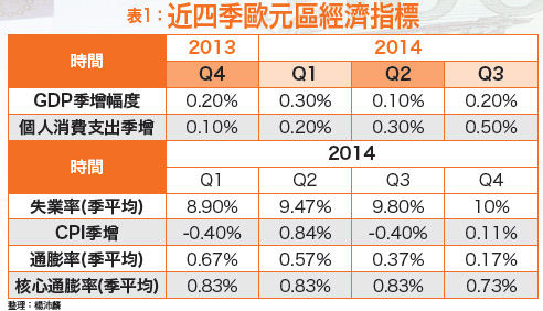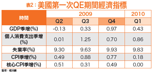 經濟指標觀察QE成效表一顯示歐元區近期幾項經濟指標,可以發現近一年來通膨率有持續下滑的現象,雖然因油價大跌,影響去年第四季表現,但以扣除油價的核心通膨率來看,也不見增加跡象。再加上失業率持續攀升,油價下跌雖使個人支出增加,但GDP也沒有較明顯的增幅,可見歐元區經濟體正遭遇困境,若不採取改善措施,恐怕難以避免歐元區走向通縮。那麼,要如何知道QE有沒有成效,或經濟體有沒有逐漸擺脫通縮威脅呢?或許我們可藉美國經驗作為借鏡。表二顯示美國在第一次QE期間的經濟數據,若扣除二○一○年第一季歐債危機延燒的影響,GDP、CPI都能看到穩定增長,顯示在消費物價緩漲的情況下,GDP也能同步受惠。其中,失業的改善速度會比較慢實屬正常,因為即使景氣好轉、業務量增加,由於企業不敢確定榮景會維持多久,初期會偏向採用加班的方式,直到確認營運真的好轉,才會開始增聘員工。