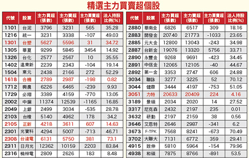 農曆年封關前最後十個交易日,台股來到前波高點附近,權值股大哨一吹,年前衝關股輪動加快,主力買賣超透露神秘的訊息。再過幾個星期即將進入農曆封關,受到國際情勢影響,指數向上衝關,且以往年的經驗來說,紅包行情會提前發動,不會等到封關前幾日才啟動。上星期最大權值股台積電(2330)、大立光(3008)雙雙創下歷史新高,資金行情美夢成真,也帶動大盤指數漲了三百多點。權值股表態 點燃衝關行情雖然這波屬於權值股的行情來得出其不意,不過仍有許多個股擁有營收、新聞題材等利多或是低檔轉機股,已經接收到「紅不讓」的能量,開始輪動表現。歐洲央行已經決定推出量化寬鬆政策,每月收購六百億歐元資產,讓投資人放下心中一塊大石頭,不確定感逐漸消失。債市方面,因美元升值趨勢確立,熱錢最愛的還是美元相關的債券,更重要的是,全球主要股市將迎來熱錢堆疊而起的大多頭行情,其中,台股是少數符合條件的好市場,國際資金有機會續買台股,墊高指數行情。值得注意的是,上周外資累計連續五天買超,金額合計高達六七九億,也是近年來罕見的大買超。目前外資圈維持著持續性買超,融資幅度一直減少,法人作價方式不變,不過也需要提醒投資大眾,股價漲高時自然容易拉回,須提防短線資金的調節賣壓。主力籌碼介入的徵兆這次選股主要是利用主力買賣超的方向,透過成交量的增減變化,以籌碼面找出優質的個股,作為預測股價未來趨勢的參考。此次選股邏輯要從主力買超(張數)說起。所謂主力買超是以當日個股之總成交量乘以○.○三,作為選取主力買超券商的基準點,而選總成交量的○.○三,是因為不能看散戶買進十張就說是主力買超。根據經驗法則,必須要有一定以上的張數才能稱為主力買超。將選取出的券商買超張數加總,則為「主力買超(張數)」。反過來說,主力賣超是以當日個股之總成交量乘以○.○三,作為選取主力賣超券商的基準點,而將選取出的券商賣出張數加總,則為「主力賣超(張數)」。
