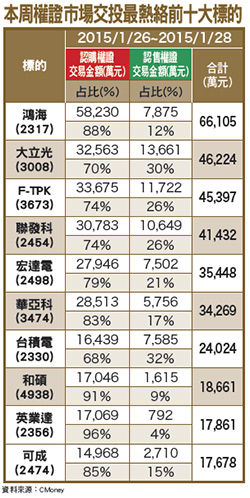 本周權證市場交投熱絡標的仍以電子權值股為主,不過認購王換人做做看,由鴻海(2317)奪得,由於鴻海去年下半年蘋果新品拉貨動能衝高,有助拉抬鴻海集團去年獲利表現,全年獲利可望再創歷年新高,吸引法人買超,投資人也積極搶進認購權證。