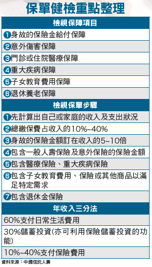 依據每一階段的需求 調整出最適合自己的保單至於如何有效利用年終獎金來補足保單上的缺口?南山人壽產品發展暨行銷資深副總王瑜華指出,不同的年齡階層有不同的需求,如中高齡族群要以退休準備和長期看護險作為規劃重點,其中退休規劃工具要特別留意穩健性,不妨善用具穩健特質的年金險或終身還本險,以確保老年生活擁有固定的經濟來源;至於長期看護險由於受到未來台灣高齡化和少子化趨勢影響,更應及早準備,才能讓自己和家人備而無患,以便因應緊急救助。另外,青壯年亦需檢視醫療保障額度是否足夠,年輕族群則要加強意外保障。而如何去檢視保單?全球人壽商品研發處鄭中安資深協理建議,民眾可透過五個步驟,做好個人及家庭的財務規劃與風險管理。首先,利用年終檢視過去一年家庭財務收支情形,將總收入及基本生活開銷全數列出,了解全年度家庭收支是超支,或有額外儲蓄。若出現超支,須確認明年是否可開源節流,以免造成家庭負擔;若有額外儲蓄,則可考慮進行短中長期的財務規劃及分配。第二,評估未來家庭財務的短、中、長期目標,包括是否有旅遊計畫、是否需增加子女教養費用、是否有中長期性購屋目標,以及長期性的退休規劃等;尤其是長期性的退休規劃,較容易因準備購屋或儲存子女教育基金的壓力而忽略。第三,檢視家中現有資產及負債狀況,包括活存、定存、基金、股票、不動產或保險等分配方式、現有價值及投資報酬率;負債項目則包括房貸、車貸、信貸或學貸餘額等,並保留至少半年家庭月收入的緊急預備金,才能在突發狀況時,仍能安然度過。維持保單的靈活彈性 才能充分發揮效益第四,每年年終應進行家庭風險評估,並請專業壽險規劃師進行保單健檢。因為保單必須要隨著家中人數、年齡及財務狀況作調整,尤其是有房貸壓力或家庭成員結構改變時,家庭主要經濟來源者的責任變大,更需要透過保險保障。此時可透過定期險或投資型保單,提高壽險保障額度;或考量加強全家醫療保障,以補足家人生病時的醫療支出,以及因照顧家人而間接造成的收入損失。最後,在檢視完現有資產及保單健檢後,依家中計畫重新調整資產分配及保險規劃;可依財務目標時程及風險承受度為基礎,選擇適當的保險及理財工具。卓長興最後建議,至少一年一次重新檢視家庭或個人的理財規劃及保單內容,依現階段的狀況及未來的需求做適當調整,才能提供個人及家庭最完整的保障。