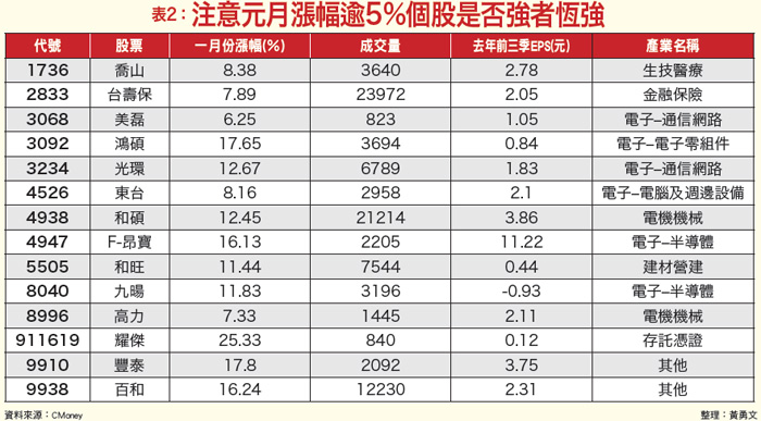 新春買什麼股票一個月後一定會漲?理周投研部發現五年來這廿六檔個股有這種特性,投資人不妨小試身手,測驗今年是否也不例外。而元月起漲的鴻碩、喬山、美磊等,二月可望強者恆強。外資大舉匯入台灣超過了去年匯出的金額,繼美國撒鈔票(QE)後歐盟也開始撒鈔票,當這波國際資金潮湧向全球時,台灣準備好了沒有?按央行對國際熱錢的老規矩,錢進台灣的外資必須進入資本市場,所以熱錢加碼台股的行情恐怕才開始而已。上周由外資主導買盤十天左右買了一千多億,代表散戶的融券也減少了十六億,雖然沒有衝上去年九五九三的相對高點,但已充分顯示外資看好台股未來的長期趨勢。只是國人或見國際利空黑天鵝滿天飛,或因接近農曆年前封關,不想抱股過年。畢竟國際股匯市震盪激烈、希臘問題未解,春節長假中全球的不確定因素太多,持盈保泰還是最穩妥的策略。國內經濟穩定 年前資金寬鬆時序進入二月份,農曆年前通常是市場資金最寬鬆的時間點,政府也會規劃相關的政策與財政預估,從現在算起約有二個多月的財報空窗期。國發會公布去年十二月景氣對策信號,由於進出口數據不理想,中斷「連十綠燈」的好成績,從代表平穩的「綠燈」變成代表轉向的「黃藍燈」,景氣領先指標雖持續下跌但跌幅逐漸縮小,同時指標保持上升趨勢;整體而言,當前全球經濟風險雖然較幾個月前略微提高,但國內經濟仍大致上趨於穩定。而全球經濟方面,美元指數獨強,油價持續在低檔震盪,全球第二大經濟體中國持續走軟,一月官方製造業與服務業PMI雙雙令人失望,其中製造業PMI正式墜入景氣榮枯分水嶺五○以下,為近二年半來首見景氣萎縮,就連原先表現相對強勁的服務業PMI,也創一年新低,造成中國上證指數漲多拉回修正。陸股雖然震盪拉回,台股卻不斷挑戰前高。既然外資看好台股未來行情,可以由幾方面著手勝算較大:首先,內外資金交疊,買盤資金動能無慮。更何況外資未平倉量曾經多達二萬口以上,預料政策作多意願在農曆年前封關會相對平穩,接著內資在年後歸隊後,也將大舉投入股市布局,屆時台股有機會重回千億以上的動能。在新台幣方面,又貶破了三一.五,則有利於出口類股,尤其是電子類股。而三月德國漢諾威(CeBIT)電子展開幕,有利於中小型電子股。