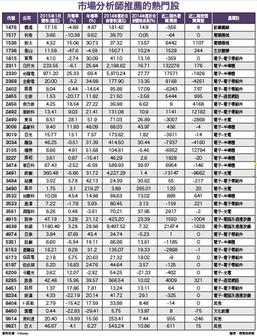 分析師叫進 法人反手賣超者 後市難有表現本周市場分析師所叫進標的股,主要仍以電子族群股為主,所屬次產業則主要散見於半導體、光電、通訊網路、電子零組件、電腦及週邊設備等族群為選股方向。至於所叫進非電子類股方面,則大多落於紡織纖維、電機機械、生技醫療、其他類等族群股,個股產業涵括範圍依舊略嫌繁雜。在這些標的個股之中,從市場外資及投信法人近期買賣超來加以分析,依舊有不少標的股,近期是被外資、投信所反向操作、反手賣出者,如:群創(3481)、聯詠(3034)、毅嘉(2402)、亞光(3019)、嘉聯益(6153)、鈺創(5351)、今國光(6209)、金像電(2368)等個股,可想而知,後市股價將不易見到上漲走勢。從財報分析角度來看分析師所叫進個股,近期所公布財報數字表現較差的個股,有:霹靂(8450)、原相(3227)、毅嘉、華亞科(3474)、喬山(1736)、昇陽科(3561)等,它們卻還是出現在市場分析師叫進名單上,無法通過財報面選股標準篩選,理由無法讓人信服!