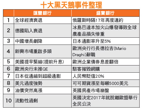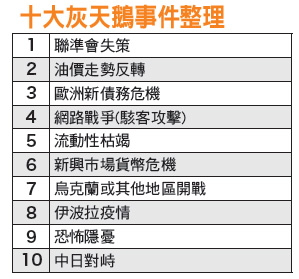 許多研究機構與投資媒體,會在每年年底針對當年經濟局勢進行總結,同時推測來年的經濟大勢,可以幫助投資人預測新年的國際經濟情勢,並鎖定觀察重點。以去年匯豐銀行與丹麥盛寶銀行提出的「十大黑天鵝事件為例」:從表中左右共二十項預測來看,有五項為全球性、十五項為區域性;其中更有八項與歐洲有關,兩項與日本有關,兩項與大陸有關,可見對於這些研究機構而言,歐洲的政經問題是今年經濟主要的動盪來源。此外,關於全球經濟的最大擔憂仍在於全面衰退可能性,以及對於日本財稅政策效果的悲觀;要解決這些問題非一朝一夕,預料今年將會如影隨形地糾纏著投資人。此外,今年至今僅短短不到三個月的時間,這些預測似乎已逐漸應驗。首先是歐洲央行按表操課地推出QE,在化解市場疑慮的同時,也消除今年一項潛在的黑天鵝危機。至於新興市場則一直處於多頭走勢,尤其中國大陸、印尼、印度、菲律賓、智利、墨西哥等,因而此項變數亦可令人稍稍放心。黑天鵝指的是「極不可能發生,但實際發生將帶來極大衝擊」的事件,由於其極不可能發生的特性,令傳統的分析研究無用武之地,也使得關於黑天鵝的預測,都帶有天馬行空的成分。為了能夠透過分析使預測具更高的可靠性,因此便產生了「灰天鵝」的概念,其意指「並非完全不可預測,但暫時能見度低」的事情。以去年年底《華爾街日報》提出的「十大灰天鵝事件」為例:升息、油價、網路攻擊關注度高