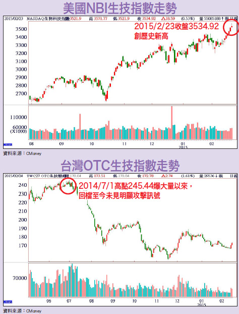 美國NBI生技指數創新高,但台灣自基亞事件重擊,OTC生技指數自二○一四年達高點爆大量後回檔至今仍未出現明顯攻擊訊號。生技股王浩鼎三月底上櫃,有機會帶動生技族群全面啟動!回顧近兩年美國NASDAQ生技指數(以下簡稱NBI指數)屢創新高,二月二十三日收盤更創下歷史新高紀錄,達三五三四.九二點(見左頁附圖),而台灣生技股雖有連動性,卻總是慢半拍,自二○一四年中基亞事件後,量能一路下滑,基期雖低,卻仍在等待發動訊號。工銀證券投資顧問廖昌亮分析,就基本面而言,影響美國NBI指數持續飆漲的因素很多,不過還是以基本面為主,包括: 1.是否有併購機會;2.新藥臨床試驗進度是否順利;3.是否認列研發相關之權利金;4.是否取得新藥藥證;5.已取得藥證是否反映在營收上。除了個股基本面會顯著影響NBI指數表現外,就非基本面而言,亦有兩項因素必須考慮:IPO家數增加,以及充沛的資金動能。廖昌亮也不諱言地表示,就資金的效應來看,在台、美兩地更可見其差異性,去年十月美國預告將結束量化寬鬆的貨幣政策,加上美國景氣溫和復甦,全球熱錢快速回流美國,進而推升美股表現,尤其NBI指數漲勢更為凌厲,處於歷史新高點。然而,同期間台灣僅有外資力拱大型權值股,而昔日推動中小型股的內資卻處於觀望態度,甚至有部分資金外流的現象,導致台灣生技股交易冷清,因此,如何重拾投資人對台灣生技新藥股的熱情與信心,除了基本面外,資金面的投入亦將扮演關鍵性角色。回顧二○一四年,生技股價表現有如雲霄飛車,波動性之高堪稱歷年之最。然而,生技類股的波段漲跌,「新藥」仍為主要關鍵,重要的新藥個股常扮演發動機的角色。新藥股是發動攻擊重要關鍵像是智擎(4162)胰臟癌新藥MM-398第三期人體臨床試驗期末解盲後,其療效數據顯示有顯著差異,股價以連續漲停表態慶賀,並進一步帶動中裕(4147)、浩鼎(4174)與相關新藥族群聯袂大漲,也帶動學名藥、醫療器材、植物新藥、保健食品與醫美等次族群個股接連強勢表態,再次開啟生技投資熱潮,帶動生技族群在去年第二季都有不錯的表現,並於去年七月初來到相對高點。