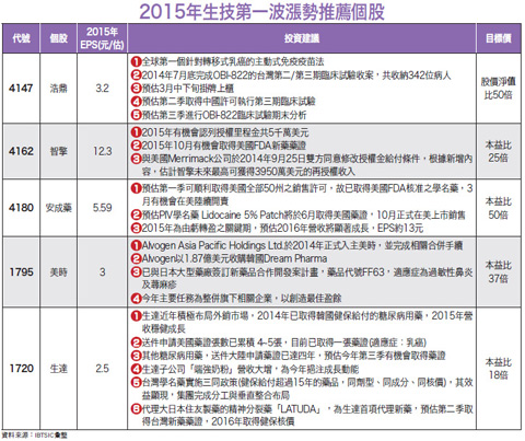 然而,二○一四年七月二十八日,是台灣生技股震撼的一天。基亞(3176)宣布,其在台灣進行第三期人體臨床試驗的肝癌新藥PI-88,期中分析未達到預期療效後,股價一路崩跌,進而造成整體生技族群順勢拉回修正,其後股價稍有反彈,但第四季仍受到許多其他因素影響,使得族群股價再次向下修正。告別跌宕的二○一四年,二○一五年台灣生技產業仍讓投資人相當期待。今年有許多生技新藥與特殊學名藥公司有機會取得藥證、送件申請藥證、進行臨床試驗期末分析或完成臨床試驗收案、認列相關里程權利金、對外授權等重大事件,有些生技新藥公司則有機會從本夢比進入本益比收成階段。市場人士指出,由於證所稅後遺症影響,持有興櫃股票一旦到上市櫃之後,就沒有持股百張以下免稅的稅制優惠,未滿一年成交一張就要課一五%的證所稅等規定影響下,不少主力大戶為避稅,去年十月開始就陸續調節手上的生技股,加上今年外資提早放假,長假的資金壓力,讓主力利息支出增加,進行調節為正常反應。股王轉上櫃 領頭羊帶動漲法人認為,主力將在農曆年後歸隊,加上生技股王浩鼎將在三月底正式上櫃,市場預期浩鼎將帶頭發動族群輪漲,馬年台股封關最後一天,浩鼎就發起生技族群起漲訊號,股價自三六一.四九元漲到三八五.一九元,漲幅達二四.六二%,相關新藥類股也連番上漲。廖昌亮分析,二○一五年可望是台灣生技業蓄勢待發的一年,多頭走勢有兩大波。其中第一波可能為二月底至四月初,第二波可能為九月初至十一月,其餘時間或有零星事件,像是基亞肝癌新藥PI-88將提早進行台灣第三期人體臨床試驗之期末分析,時間點可能會在今年六月至七月。廖昌亮認為,未來生技族群將擁利多或利空而各自表述,強弱會更加分明,投資人在布局上,應由基本面審慎著手選股,配合題材面與籌碼面操作,未來整體生技族群齊漲齊跌的現象,恐不易再現,因此掌握個股的基本面與重大事件的發生時程,將是未來投資決勝的關鍵點。第一波攻勢發起 動能延至四月初生技新藥股第一波多頭走勢,推估其時間可能為二月底至四月初,驅動股價上漲的主要動能,就是浩鼎掛牌上櫃,浩鼎將於三月三日舉辦上櫃前法說會,說明其新藥研發進度與公司相關規劃,並於三月下旬正式掛牌上櫃。廖昌亮進一步指出,由於第一波多頭攻勢並非由基本面所驅動,僅為題材面與資金面主導,故多頭有機會掌握一個月左右的時間進行反彈,不過許多重要生技股反彈一五%~二○%左右,即將面臨前波套牢區,故在操作上仍宜審慎。但若是未來市場表現也能如此活絡,不啻是為冰封數月的生技股注入一股暖流,帶給投資人極大信心。而第二波多頭走勢,推估時間點可能落在九月初至十一月,驅動股價上漲的主要動能,為浩鼎的乳癌新藥OBI-822將於九月左右進行台灣第二、三期人體臨床試驗期末分析,屆時若解盲後數據良好,療效具有顯著差異,則其股價有機會向上噴出,將會再次帶動生技新藥投資的熱潮,重拾投資人對生技股的信心。