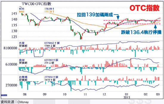 外資不斷匯入,台股榮登外資2月買超王,但融資水位還在低檔,成交量也放不大,顯示投資人戒慎恐懼,不敢追高。在此氛圍下寧可布局低基期補漲股,及跟進整理完成暴量再起的潛力股。理周投研部建議聚焦生技、車聯網、Apple Watch相關個股及水資源概念股,低接加碼迎接波段行情。操作策略:★外資滿手權值股的現象不變,操作仍以低基期、中小型股為主軸,同時當OTC指數拉回139時,可加碼兩成持股水位,總持股部位來到五成。★可加碼族群除原有之生技、車聯網、Apple Watch相關個股外,亦可選擇水資源概念股國統(8936)、千附(8383)。觀察指標:★指標數值:OTC指數跌破136.4,執行停損。★生技指標股美時(1795)若股價大幅拉回,調節部分生技持股。★大陸兩會結束後,相關概念股表現情形。大盤後勢看法:★台股先前創高來到9699點,隨後進行拉回技術面修正,乃合理現象。預估指數回補2/13缺口上緣9540點後,拉回再上。★法人交易占台股比重持續上升,已超過40%,投資需更留意法人動作。★外資匯入續創歷史新高,小心逢高調節。