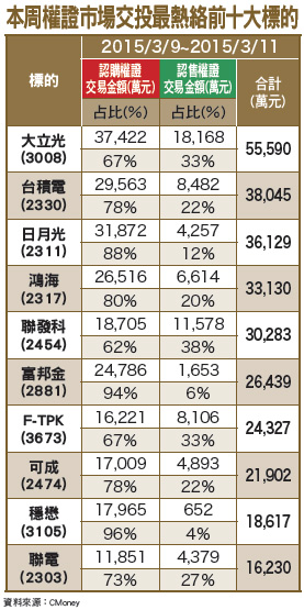 本周盤面亮點堪稱是蘋果的新品發表會,如市場預期公布Apple Watch產品規格、最終定價、開賣日期等細節,概念股再受市場矚目,台廠PCB、石英元件、晶片、IC載板等相關供應鏈可望受惠,股價受題材激勵帶量創下新高,認購權證也吸引投資人青睞。上市櫃公司二月營收陸續公布,優於預期個股吸引由漲多股流出的資金進駐,盤面上普遍表現強勢,例如獨家接獲Apple Watch晶片SIP封裝訂單的日月光(2311)二月營收即優於預期,鴻海(2317)首季營收也可望提前破兆,金融股王富邦金(2881)也因獲利亮眼,股價續創新高,相關認購權證都為市場交投熱絡焦點。台股短線陷入高檔震盪整理,可留意蘋果新品供應鏈、二月業績表現佳的族群,以及三月旺季、業績題材相關個股,包括半導體、LED等盤面熱門族群,並利用認購權證槓桿操作掌握行情,也可酌量布局指數型認售權證規避大盤可能修正的市場風險。