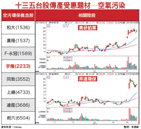 中國四月即將出台「十三五計畫」相關施政重點,台廠有機會拿下巨大商機,傳產相關族群後市不容小覷!其中以污染防治、科技農業、水利建設及汽車零組件最為看好。經過前幾個「五年計畫」施政目標的落實與大規模建設之後,中國固然獲得了經濟發展的巨大躍進及傲人成就,國民生產毛額(GDP)也大幅成長,經濟體規模巨幅膨脹,成功超越美國成為全球第一,人民財富積累速度之快,亦前所未見。但是,中國卻也在一味追求高速經濟發展的同時,整體國家、社會、人民,都因此付出了環境污染嚴重、糧食生產量高低變化過大、食安問題層出不窮、用水供給量豐枯不均與澇旱災為害程度加大…等重大代價。污染防治、科技農業、水利建設商機大因此,金融市場及產業分析人士大多預期:中國政府在此次「十三五計畫」建設綱要內容中,將會再度強調做好污染防治、科技農業、水利建設等施政工作重要性,預料也將有機會為台灣污染防治、農糧產量提升、水利建設材料供應鏈等相關廠商,帶來龐大商機。分析中國境內嚴重空氣污染的主要成因,據官方調查統計資料指出,除了天候氣象條件不利於空氣污染物快速擴散,更包含工業用燃煤、生產過程所排放空污,以及各式大小機動車輛廢氣排放、中國北方冬季大量燃煤取暖等因素,污染物排放量巨大,對空氣品質產生危害。
