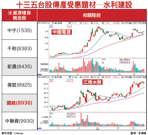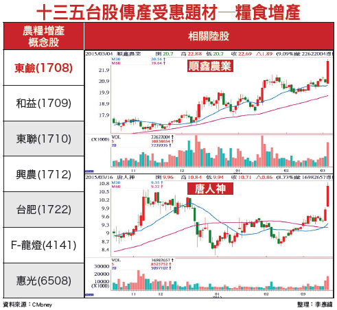 農業科技化 糧食產量增長穩定中國大陸過去數十年來,農民對化學肥料的使用量,每年平均以二一%速度穩定增加,成為全球化肥的高使用量國家,而化肥用量的增加,也對農業生產量的提高帶來相當大貢獻。一九九六年,中國糧食總產量即已突破五億公噸,人均糧食產量也達到四二一.七八公斤,與一九四九年相比,大幅成長達四倍。推算起來,化肥對中國糧食產量增長貢獻率,平均為四一.九七%。不過,近年來,中國糧食產量已明顯跟不上國內快速成長的糧食消費需求。糧食供需仍無法充分自給自足,須仰賴大量進口糧食才能滿足國內需求。因此,二○一三年十二月,中國對國家糧食安全戰略作出重新修正。不過,糧食政策達成自給自足的戰略目標,看來已越來越不容易達成。二○一三年,儘管中國實現連續十一年的糧食大豐收盛況,卻還是進口高達七千萬噸大豆、二千五百萬噸各類穀物,與前一年相比,進口總量年增率高達二二%。由此可知,為滿足日益提高的糧食消耗需求量,達成官方所要求年度糧食供應安全穩定數量一.一兆公斤以上,中國未來對於化學肥料的使用量,必定只會再增加,也因此可直接為生產化肥的企業帶來穩定成長龐大商機。台灣相關化肥生產廠商,占有化肥產品運輸至中國較歐美業者更近的地利之便,後市中國化肥市場商機所帶來的挹注效益,令人相當期待。多種農民常施加的肥料之一鉀肥,目前全球庫存正持續減少。去年開始,美國硫酸鉀大廠GSLM因併購美國新複合肥料廠,鉀肥供料需就近支援新廠產線下,減少對亞洲地區供貨,造成亞洲硫酸鉀供不應求,市場缺口浮現,且短期內不會回補,有助亞洲硫酸鉀廠市場產生替代效益。鉀肥大廠東鹼 糧食增產受惠大台灣鉀肥產銷大廠東鹼(1708)指出,目前在手訂單已滿到今年上半年,在市場需求現階段仍供不應求下,上半年毛利率有機會持續高檔。第十一、十二條新產線已提前在二月投產,今年年產能將可擴增達十三萬噸以上。法人樂觀看待,東鹼今年全年營收將可望有兩成以上增幅。同時,有關進軍中國,搶食龐大化肥市場商機方面,東鹼已與青島鹼業合資成立「中國青島鹼業鉀肥科技公司」,東鹼持股一五%,規劃多達八條產線,年產能總計多達九萬噸,將主攻中國大陸肥料內銷市場,前兩條生產線已按規劃於去年十月順利投產,未來將很有機會持續受惠於中國化學肥料穩定成長龐大商機。東鹼旗下尚有航運事業,目前擁有六艘輕便型散裝貨輪出租中,預計今年第四季會有一艘新船、二○一六年還會有兩艘新船加入營運,二○一七、二○一八年尚分別會各有三艘新船交船營運。船隊租約以長租型式為主,下半年預定還有處分兩艘舊有散裝船計畫,順利的話,將可獲得約五百萬美元的處分利益。東鹼化工事業占整體營收超過七成,輕便型散裝貨輪出租則占約二成比重。東鹼去年營收為四一.八四億元,年增率三.三%,理周投研部預估,全年EPS約四.一五元,去年獲利有機會寫下近幾年新高。預估東鹼今年營收有望再成長二○%,增加至五○.二一億元,全年EPS至少可達五.五七元。目前本益比七.一倍,歷史本益比區間為四.五~二六.九倍。重大水利工程投資 規模逾八千億人民幣去年十二月,中國環境科學研究院副院長在「二○一四中國環保上市公司峰會」上表示,《水污染防治行動計畫》(即「水十條」)即將正式公布,籌畫多年的「水十條」終於揭開面紗,正式實施。中國國務院總理李克強接著在二月作出指示,須儘速加快國內各項重大水利工程建設腳步。中國重大水利工程主要項目包含農業節水、新建大型灌溉區、引調水體、重點水源與江河湖泊污染防治管理等,預計投資規模超過八千億人民幣。官方認為加快建設此類重大工程,事關民生福祉,同時有利促進各區域間平衡發展,對國內經濟發展穩定成長具重要意義。受惠中國相關重大水利建設施作在即,台灣工程、鑄鐵管大廠國統(8936),於中國耕耘已久,業務即將起飛。國統以往承接政府標案,原本即多以水資源建設為主,占總營收比重約九○%,為台股純度較高水資源相關公司,預料將成為中國本波重大水利工程建設最主要受惠廠商。國統轉投資的中國「福建台明鑄管」,持股比例過半為五一%,主要營業項目為球墨鑄鐵管生產與銷售。球墨鑄鐵管簡稱「DIP」,是由鑄造鐵水經添加球化劑後,再經離心球墨鑄造機,用高速離心力所鑄造成的鑄鐵管,因防鏽效果佳、使用壽命長,近年來逐漸取代傳統的鋼襯預力混凝土管(PCCP),廠商出貨量持續成長中。