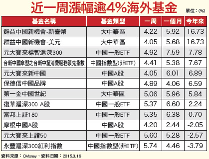 中國政協、人大兩會閉幕,總理李克強指出,中國經濟成長雖面臨相當大的下行壓力,但對於經濟形勢改革的決心不變。此政改宣示也激勵上證指數攀上近五年高點,累積今年來漲幅突破六%。中國政協、人大兩會日前閉幕後,總理李克強指出,中國經濟成長雖面臨相當大的下行壓力,要達七%的成長目標並不容易,但他也強力表示,若經濟減速衝擊就業,將擴大力度,針對經濟形勢、體制改革、反腐舉措以及外交政策等方向,穩定市場信心。政策作多 陸股仍有上漲空間在政策明顯作多,加上市場預期會有更多經濟刺激措施的推出下,也激勵了上證指數攀上近五年高點,累積今年來漲幅突破六%,推升相關基金成為近期海外基金投資的亮點。近一周十二檔績效逾四%的海外基金,全由陸股、大中華基金囊括,在中國政策推動經濟的效益可期,以及歷史經驗顯示兩會後陸股走勢向上,預期中國股市仍有上漲空間。中國總理李克強,對於經濟保持中高速穩定增長持樂觀態度,此外,其穩定住房消費的說法,亦還原了中國房地產應有的地位,由於股市及房地產前景,對於市場信心及公眾信心不啻是重要指標,因而對於股市及債市也注入相當程度的信心。台新中証消費服務領先指數基金經理人葉宇真指出,為支撐經濟,中國人民銀行去年十一月來已二度降息,今年二月並調降存準率,外界預期人行下季還有降準空間。今年初以來中國市場震盪,起因於市場懷疑流動性改善邊際趨弱,但是二次降息將消除此疑慮,持續的降息與降準一方面確認政策寬鬆方向,另一方面在累積效應下將壓低利率。政策傳遞寬鬆基調 藍籌股與題材股大漲日盛中國內需動力基金經理人鄭慧文表示,兩會閉幕,政府傳遞出政策寬鬆的基調,各項改革在今年將繼續深化,受此激勵,三月十六日在藍籌股與題材股攜手作多推動下,A股放量大漲,上證指數不僅成功站上三四○○點,還突破了三四○六點前期高點,創下六十七個月來新高,另外A股周度新增開戶數也達到約六十六萬戶的水準,高於均值的二十四萬戶,顯示市場情緒再度上升。