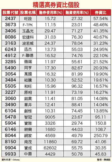 指數已達萬點附近,選股難度大大提高,低基期、高殖利率與軋空題材將成為盤面主流。時序進入四月份,由於各上市櫃公司召開股東會日期大多在六月中旬至下旬,除權息又緊接在七、八月份,融券回補壓力逐漸增加,出現軋空行情,加上國際熱錢不斷湧入,將台股推升至萬點關卡附近。面對台股屢攻不破的萬點大關,選股難度大幅提高,隨之而來的是強大心理壓力,在此情況下,究竟該如何選股?留意高券資比及高融券維持率台股每年會有兩次融券回補的旺季,分別是在每年四月及七月初附近。由於六月中下旬為上市櫃公司召開股東會的旺季,按規定股東會前兩個月,公司為了造股東名冊,需強制回補融券,因此每年四月份均會出現部分個股融券需強制回補的軋空行情。而台股除權息的旺季大多在七、八月份,融券最後回補日為停止過戶起往前推算第六個營業日,所以六月底、七月初時也會有軋空力道。表一為券資比高,且有機會繼續走出軋空行情的個股,在萬點行情來臨時將能提供籌碼推升的力道。波若威(3163):光通訊部件代工廠,今年營運極具轉機性,去年造成營運不佳的兩大主因,包括產線自動化良率偏低,與北美庫存過高等問題,目前已逐一解決。主力客戶Finasar營運展望正向,近月股價亦大漲超過一成以上,此外在西班牙客戶訂單挹注下,營收可望逐季向上。另一方面,中國4G進入爆發階段,雲端資料中心帶動光纖零組件需求,產業長線趨勢無虞,保守推估今年獲利可望重回過去高峰。預期在獲利明顯回升下,股價將持續走強,加上目前券資比仍在四成左右,融券使用率亦在三成以上,在基本面的推升之下,將激勵未來股價動能。單井(3490):專業LED及半導體封裝模具及自動化設備廠商,產品應用涵蓋LED、IC半導體封裝、光耦合器及整流二極體等。此外,公司亦布局太陽能業務,主要市場為日本關東及關西地區,主攻家用市場。今年以來單井營收表現亮眼,受到日本太陽能家用板需求增加,一月營收較去年十二月份微幅增加三%,且二月份未受到工作天數減少影響,營收表現更為亮麗,持續呈現微幅增長的趨勢。在需求帶動下,三月營收可望重回二億元關卡,而LED設備部分也接到大單,下半年營運將大躍進。營建類股因為會計準則的規定,必須在全部完工後才能做出營收及獲利的認列,所以也經常出現單一年度的獲利暴增。在沒有資金需求的情況下,公司大多會將獲利回饋於股東,因此在每年年報公布後,往往會出現超高殖利率的個別公司。由於目前大盤位階處於高檔,故高殖利率、低本益比的營建族群,可望成為下波焦點。