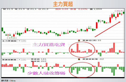 沒有主力操作的股票不會漲,這是千古不變的道理;但畢竟「萬般拉抬只為出」,唯有掌握個股全盤基本面,才能在瞬息萬變的行情中運籌帷幄。近日台股殺聲震天,許多中小型股連連中箭,其中主力色彩濃厚的個股更是綠光罩頂。受到股市名嘴涉嫌炒作特定股票一案影響,加上去年生技股基亞(3176)新藥事件,導致市場對於主力股敬而遠之,也讓近期盤面許多中小型股接二連三倒地不起。主力買超 股價偏多訊號主力的定義大多針對公司派的大股東,或者是資金雄厚的投資者而言,由於公司派掌握多數籌碼,並且了解公司最新狀況,因此大股東的一舉一動,都將牽引著股價未來的走勢。而對於股本較小的企業來說,由於股本小,籌碼安定,加上外資介入不深,是很好炒作的標的,若大筆資金湧向市場買進公司股票,則籌碼集中度高便容易操縱股價。至於要如何掌握主力的動向?一般投資人除了市面上的付費籌碼分析軟體外,亦可以到證券所網站(http://bsr.twse.com.tw/bshtm/)查詢,每日盤後四點會公布全國各券商分點的買賣超。以每日買賣超券商來看,可以先把每日買超該檔個股的券商分點做排序,通常是以個股每日前十五大買賣超券商排序,然後將前十五大分點的合計買超張數加總,再減去前十五大賣超分點的合計賣超張數,便是每日的主力買賣超。少數人吸收多數人籌碼 奇怪咧一般來說,主力買賣超會與股價同向變化,主力大幅買進時股價便會上漲,因此當看到主力買超時,就是股價的偏多訊號。再者,如果先從每一個有交易的券商分點來看,當賣出個股的券商分點家數大於買進個股的券商分點家數,表示市場上大多數的人都站在賣方;但是若此時股價不跌反漲或者處於整理區,就表示這些大多數人賣出的籌碼遭到少數買進的分點全數吸收,表示買進個股的券商分點所買進的力道,大於賣出個股的券商分點,而市場上有此能力大量吸收遭大多數人賣出的籌碼者,絕非出於一般散戶或中實戶。
