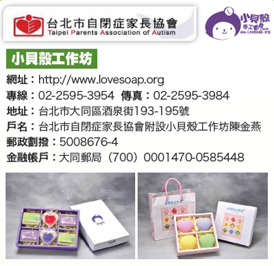 民國七十九年,一群自閉兒家長擔心孩子未來在社會上無法獨立,成立了台北市自閉症家長協會;隨著孩子一天天成長,不能時時依賴家長的保護,協會於是附設小貝殼工作坊,帶領這群像貝殼珍珠般的孩子走向社會,讓他們找到自己獨一無二的人生價值。小貝殼工作坊成立至今已十九年,提供十五歲以上心智障礙者(以自閉症為主)庇護就業,培養正確工作態度、增進工作技能與人際互動,發揮所長,建立自信,獲取合理薪資。祝福全天下媽媽 母親節快樂!母親節即將來臨,對小貝殼的每位自閉兒而言,在這感恩的日子,只有更努力工作,才能回報「父母深情,永不放棄」的愛。