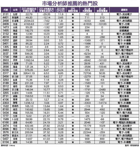 在這些個股中,依舊有不少近期是被外資、投信反向賣出的,如:聯電(2303)、凌陽(2401)、友達(2409)、京元電(2449)、奇力新(2456)、宏達電(2498)、長榮(2603)、欣興(3037)、景碩(3189)、隆達(3698)、創惟(6104)、盛群(6202)等,可想而知,後市股價難見亮眼漲勢。從財報分析角度來看分析師叫進個股,近期公布財報數字表現較差者有:集盛(1455)、台南(1473)、友達(2409)、宏達電、弘塑(3131)、璟德(3152)、東隆興(4401)等,卻仍出現在分析師叫進名單上,無法通過財報面選股標準篩選,令人難以放心買進!