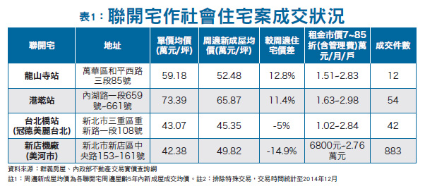 不過,因大台北地區捷運宅的特性是「到站即到家」,而除了十一種特殊身分者外,其餘將租給二十至四十五歲於北市設籍或就學、就業之青年族群;由於這一世代年輕人的消費觀念強調「方便」,加上捷運宅是全新房子,配備又是最新的,因此預料仍將會掀起一股搶「租」潮。此外,這項政策能否落實,意味著市長柯P於競選時所提出的五萬戶社會宅政見能否有個成功的開始,因此相信市府人員一定會盡全力促成;只是,五萬戶社會宅的數量極為驚人,以台北市現有的公營住宅而言,目前僅有六處可供出租,包括大龍峒、行天宮站、敦煌、萬隆站、景文及永平等共二七四戶而已,柯P如何在剩下的三年半任期做到,將會是一大考驗。不過,姑且不論此項政策成功與否,至少柯P已先贏得二十至四十五歲於北市設籍或就學、就業之青年族群,以及期盼他有革新作為的選民的認同。外界目前仍存在不同聲音,包括美河市居民認為,社會宅會帶來房價的下跌、社會宅是否淪為「貧民窟」,以及捷運聯開宅的資源應該為台北市所共享,不該連非設籍台北市者也能分享等。只是,以柯P上任至今,市政幾乎全照自己邏輯行事的特立作風來看,外界不同的聲音,只怕會被視作是不同陣營的看衰罷了。四處捷運宅 位居台北市較保值 至於捷運聯開宅作為社會宅,真的會造成房價下跌嗎?根據群義房屋統計,這四處聯開宅成交狀況與周邊屋齡在五年內的住宅大樓價格比較,台北市聯開宅的價格比周邊住宅高一成左右,顯示聯開宅若位在北市,地段較好且具保值優勢。群義房屋統計四處聯開宅成交實價登錄資訊,其成交單價均價以「港墘站」聯開宅成交均價最高,每坪七三.三九萬元,較周邊屋齡五年內新成屋高出一一.四%,其次為「龍山寺站」聯開宅,每坪均價五九.一八萬元,較周邊新成屋高一二.八%(表一)。不過,也有例外,如新北市三重區的台北橋站「冠德美麗台北」聯開宅,成交均價為每坪四三.○七萬元,較周邊新成屋低五%左右;而新店區的「美河市」聯開宅,成交價格參差不齊,落差很大,成交單價為四二.三八萬元,較周邊新成屋低一四.九%。群義房屋總經理潘家成解釋,這兩站價格會比周邊房價低,主要是周邊有不錯的標的物拉高價格所致,並非要作為社會宅所引發的效應。高收入族才租得起捷運宅