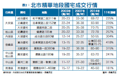 有些美河市居民因不甘捷運宅變社會宅,恐房價被拉低,打算因此將房屋賣出,對此潘家成也說,之前美河市取得價格若為每坪四十萬元,就算以每坪五十萬元出售,也還是獲利,並無虧本出售的問題。潘家成還表示,聯開宅大多位在捷運站出入口上方,十足具備「到站即到家」的交通優勢;過去捷運局一有標售案釋出,即曾造成民眾搶投標的風潮,而北市聯開宅均價較周邊新大樓高,主要也是因地理位置佳、交通及機能方便所致。他指出,部分聯開宅作社會住宅,以租金約為月薪的四分之一來計算,北市承租人月薪至少要六萬元才負擔得起,有條件承租的已是高收入者,租金還是不便宜。而未來在聯開宅將「只租不售」的情況下,有不少房仲業者談到,過去台北市政府為解決市民「住」的需求所推出的國宅,以往可能會被貼上「平(貧)宅」標籤,但歷經時空變遷,如今有不少位於精華地段的國宅,卻反而躍升含金量極高的住宅,居民可說是「買到即賺到」。信義房屋統計,從二○○三年SARS過後至去(二○一四)年的房市波動,可發現台北市有十處含金量極高的國宅,過去十一年來的漲幅相當驚人。其中,又以位於忠孝東路五段四二三巷的富台國宅漲幅四一八%掄元,其次是基隆路一段三八○巷的忠駝國宅,漲幅三一五%,以及位於大直樂群二路、敬業三路的基河國宅,漲幅也有三一一%(表二)。信義房屋公關專案經理洪琬琪表示,以往國宅多給人格局差、公設比高或棟距小等負面印象,但因北市這些國宅地點大多位於機能成熟、學區優質的精華地段,在房價節節高漲的情況下,享有總價相對較低的優勢,反而成為不少民眾進駐精華區的搶手貨。精華地段 國宅含金量高尤其在寸土寸金的台北市中心,國宅社區住戶卻能享有免費的停車位,更顯得奇貨可居。雖然近幾年來,台北市的十大精華國宅整體漲幅不小,身價幾乎翻了二~四倍,但大家還是搶著要,一旦有物件釋出,只要開價沒有超出市場行情太多,通常一周內便可成交。此外,因屋主也大多惜售,或以租代售,故釋出量極少,房價保值和增值性相對較佳。以漲幅居冠的富台國宅來說,忠孝東路五段四二三巷是北市的精華路段;忠駝國宅可擠進光復國小等優良學區,又有捷運信義線通車,加上部分戶別還擁台北一○一大樓景觀,買氣具有支撐;而基河二期國宅就在大直豪宅群聚區旁,身價自然跟著水漲船高。不過,信義房屋也提醒,儘管北市的精華國宅身價看似以二~四倍「加倍奉還」,仍有些許抗性須注意,例如量體大、戶數多達一兩千戶的大型社區,大樓管理是否良好完備等。此外,屋齡在二十年以上的房子,大都需要更換水電及瓦斯管線,還有格局不佳、樑柱明顯,以及衛浴、廚房設備老舊等問題,如果全部更新,勢必需要額外準備一筆不小的開銷。至於公設比偏高、施工品質不一等老問題,主要是因為國宅大都計入停車位面積,所以公設比普遍高達三成以上,建議民眾購買前應考量未來空間配置與隱私性。屋齡雖老 管理佳國宅仍搶手住商不動產企研室主任徐佳馨指出,「交通、生活機能與施工品質,是國宅能否保值的三大關鍵。」一般而言,符合上述條件的國宅,往往會以略低於周邊一成左右的價格,成為自住者的首選。徐佳馨也說,雖然國宅社區往往一入住便是數百戶,在公共設施上的維護實屬不易,但只要觀察該社區的電梯維護、消防設施與公共走道清理,便可略窺社區管理的績效。台北市的國宅中就有管理的模範生,如新隆國宅、延壽國宅等,其都有「社區連結緊密、居民素質整齊」等特色,建議在購買國宅之前,不妨親自走走,詢問社區店家,更能全面掌握居住品質。此外,像新隆國宅鄰近中正紀念堂,不僅交通便利,學區也佳,加上一直有重建議題,房價始終居高不下;另像位處黃金地段的世貿新城、優質學區的延壽國宅等,房價都比過去為高,甚至正義、成功國宅也都出現一屋難求的熱況。徐佳馨指出,國宅過去被貼過標籤,認為是中低收入戶的貧窮聚落,但時間證明一些具優質管理的國宅,身價甚至比臨近的一般宅來得搶手,因此,針對「只租不售」的社會宅、公營宅等,她認為重點還是在於未來的管理,若有良善的管理結果,相信社會宅會仍漸漸為出租市場所接受。