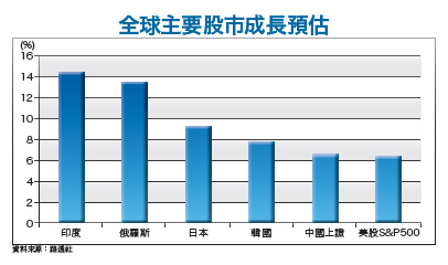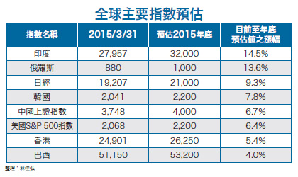 此外,中國政策投資也是今年的重點項目,尤其是促進創新創業及技術改造,已成為兩會中討論重點,包括資訊安全、第三方支付、半導體等類股,都是投資的主要方向。隨著亞投行的籌備設立,更多投資人重新看見亞洲的投資契機。首先是路透社預估投報率最高的印度,群益印度中小基金經理人林光佑即指出,經濟回復高成長是印度股市上漲關鍵,除了降息外,印度政府也積極致力於經濟改革,未來印度GDP不僅可望逐年向上成長,在國際油價趨勢向下、通膨疑慮降低等利多因素,都有助印度股市持續走揚。由於印度股市具備基本面改善,政策加持及匯率止穩等優勢,今年仍是深具投資價值的好標的,其中又以中小型股更具獲利動能及股價潛力。韓圜貶值 主要權值股雨露均霑富達投信分析指出,近兩年美債殖率愈低,印度市場表現愈好;預期在歐洲及日本持續實施貨幣寬鬆政策下,美國債券將會成為利息收入投資人追逐標的,連帶拉抬印度股市表現。至於在韓國部分,三月十二日韓國央行意外降息一碼,使得基準利率來到一.七五%的歷史新低水平,顯示韓國政府對提振經濟成長的決心。由於降息有助消費復甦,加上韓國房市目前持續強勁成長,預料將成為推動韓國內需成長的雙引擎。由於降息帶動韓圜偏弱,據美銀美林針對韓圜貶值對主要企業獲利的影響評估,包括重要的權值股如三星電子、海力士、現代汽車等,都可望直接受惠韓圜貶值。此外,若再加上韓國指標性企業開始帶頭提高股利發放,近一個月來已有外資回流韓股的跡象,其自三月起更加碼買超電子股,帶動近期科技股明顯轉強。值得注意的是,三星在備受好評的旗艦產品S6推升下,股價已突破前高。整體而言,在面對美國升息及強勢美元的壓力下,韓股第二季勢必難置身市場波動之外,但也正因為面對股市波動修正,才有機會逢低加碼基本面好轉的股票,並藉此掌握後續市場反彈的最佳時機。政策釋利多 日股投資回歸基本面因為中國崛起被迫讓出全球第二大經濟體的日本,在企業盈餘維持攀升的態勢下,帶動企業併購活動熱絡,也拉抬日系企業股利發放與股票回購規模擴大,支撐股市動能;此外,日本投資人與股東權益報酬率,亦可望在政府政策支持下受惠。 安本日本股票團隊主管郭征岳指出,東證一部指數今年以來漲幅超過一○%,表現亮麗。從相對價值角度來看,東證一部指數預估本益比是一四.七倍,比美國S&P 500指數的一五.七倍、MSCI全球指數的一六.八倍都便宜,加上日本企業公司治理與營運環境皆有所改善,也支撐日股長線表現。郭征岳提醒,日本股市雖有政策利多加持,但投資還是要回歸基本面,精挑細選優質個股才是關鍵。目前日本企業不乏許多世界頂尖一流的跨國企業,並且有相當高的營收來自於新興市場,因此,投資這些世界級的日本企業,也間接受惠新興市場的成長動能。他以嬌聯(Unicharm)為例指出,日本嬌聯在女性護理商品、嬰兒紙尿布、成人護理商品皆為具領導地位的公司,在成熟國家和新興亞洲都有相當高的市占率,資產負債表強健,股息發放率也持續上揚。嬌聯未來的成長動能將來自於印度、中東,以及拉丁美洲等國,也是新興市場人口紅利受惠題材。 談到日股未來一年的潛在風險,郭征岳分析,日幣匯率波動、全球貿易流向,以及中國經濟放緩,都值得留意;但日本最佳的企業都有因應外部變化進行調整的能力,加上企業資金雄厚,故能預先做好準備。資金挹注、題材豐富 台股高點可期