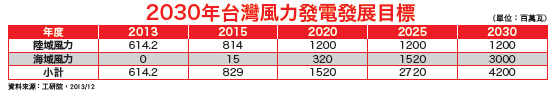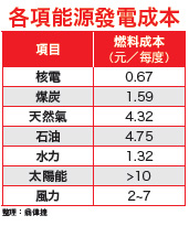 政府目前規劃中的主要替代能源方案有四個方向,包括太陽能、風力發電、生質燃料,以及燃料電池相關儲能科技,而目前資源僅集中在前兩項。台灣目前的發電結構以去年占比來看,燃煤占總發電量二七.七五%,天然氣發電占二四.五二%,核能發電占一八.六一%,其他包括汽電共生、民營電廠與再生能源等約有二九.一二%。而用燃料成本來計算發電成本,核電每度約○.六七元、煤炭一.五九元、天然氣四.三二元、水力一.三二元,至於替代能源的太陽能則超過十元,風力發電成本約在二到七元之間不等,因此看來最有潛力推廣的當屬風力發電。股市裡有句名言:「不要跟政策對作。」如果想要在產業當中找尋未來值得投資的標的,順著政策的腳步走就對了。過去太陽能在政府剛開始推行之初,在油價高漲的年代裡,成為最佳替代能源;雖然現行太陽能產業遇上前所未有的大困境,即面臨雙反稅率造成出口市場縮減的嚴峻考驗,卻仍動搖不了政府持續發展太陽能的決心。去年行政院將我國在二○三○年之前的太陽能裝置目標提高到六.二GW,達成後預估每年發電量將可達到七七.五億度,而根據台電統計至今年二月為止,太陽能總發電量達到○.八九億度看來,顯然離達成目標還有一段距離。替代能源 首選風力、太陽能