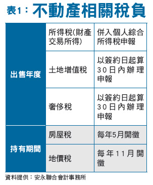 所以,一旦民眾脫手賣掉房子,「賣出價」減掉「買進價」就有「利得」收入,此在報稅時有沒有「短報」,一下子就會被國稅局查到了!目前民眾可能面對的不動產稅負,可分為出售年度及持有期間(表一)。就出售年度來說,除隔年五月要併入申報綜合所得稅外,售屋族還要在簽約日起的三十日內,辦理「土地增值稅」與「奢侈稅」的申報(買房子的人則要申報繳納「契稅」);至於持有期間,則包括每年五月要繳「房屋稅」,以及十一月繳納「地價稅」。換句話說,民眾在每年五月要繳的稅負,就有「綜合所得稅」和「房屋稅」兩大項,其中,房屋稅的多寡,政府會幫民眾好好算清楚,民眾較不用傷腦筋。除非是住在「天龍國」的台北市民,若又處於精華地段,在市府調高「房屋標準單價」、「路段率」及「房屋稅率」後,民眾在四月底前可能就會收到柯文哲市長所說的很「有感」的稅單。五大報稅族群省稅大作戰另就綜合所得稅的申報來說,約可從「售屋族」、「購屋族」、「換屋族」、「房東族」和「房客族」等五大族群來剖析節稅之道。安永聯合會計事務所執業會計師楊建華談到,財產交易所得稅的申報方式有三種,包括:一、可以舉證的成本和售價:依房屋售價,減除取得成本及相關費用,核實課稅。舉例來說,如果賣價是二千萬元,而多年前買進價格為一千五百萬元,另裝潢的相關成本約二百萬元,則以二千萬元減一千五百萬元及二百萬元後,所得就是三百萬元,再依此做申報。但民眾一定要注意,「取得成本及相關費用」都得要有收據,以取得成本來說,早期就是簽約上所約定的買賣總額,至於相關費用,例如各項裝潢的收據等等,都要保存下來,才有辦法申報。二、無法舉證成本但可查得售價之豪宅:標準為房地總成交金額乘以計算公式,此適用的是台北市總價七千萬元以上、新北市六千萬元以上、其他地區四千萬元以上的不動產。財產交易所得=房地總成交金額×房/(房+地)×15%三、其他:亦即無法舉證成本,且非豪宅者,此大多是持有期間過長,屋主已無法提出買進時的相關成本。財產交易所得=房屋評定現值×部頒標準以上三種申報方式,售屋族可視自己的情況選擇最適合的一類核實申報,但千萬不要以高報低,例如以為國稅局查不到你的「買進價」,就以房屋評定現值(一般都較低)來申報。楊建華表示,從二○一一年六月實施「奢侈稅」以來,政府先是針對大台北地區房屋總價超過四千萬元以上的物件,進行查稅動作,近幾年再依次降低至二千萬元左右的案件。由於國稅局可從建商或代銷公司取得購屋者的成本價格,因此,如果你不屬於第二類的豪宅族群,卻未依第一類申報,則屆時一旦逃漏稅,不僅會被「追捕」,還會被罰款。不過,從稅捐單位得知的訊息,目前大都是要求申報者「補稅」,還沒有被罰款。楊建華表示,就買賣不動產房屋部分的「財產交易所得額」(土地部分,課徵土地增值稅)須併入個人綜合所得稅申報,其中,民國一○三年度最高稅率為四○%,民國一○四年度新增稅率則為四五%。換屋族可善用重購退稅