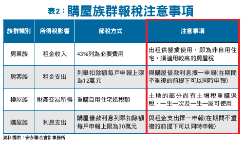 至於「購屋族」的情況,符合上述條件者,可享用「重購自用住宅抵稅額」,另每一申報戶每年的購屋借款利息扣除額以三十萬元為限。但若是同一年度為「房客族」及「購屋族」者,例如上半年還在租房子、付租金,下半年向銀行貸款買房子、支付房貸,則同年度不同期間之房屋租金支出與購屋借款利息,在不重複前提下,得分別列報綜合所得稅扣除額。舉例來說,如果張先生在前四個月是租房子,則其可申報的租金支出為十二萬元乘以(四個月/十二個月),因此只能申報四萬元;而後八個月有房貸支出,這部分則以三十萬元乘以(八個月/十二個月),故可申報二十萬元。上述兩者合起來可申報的金額就是二十四萬元。