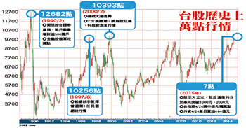 台股睽違十五年再見萬點行情,令人期待也怕受傷害。一般投資人若不是在二○○○年以前就參與股市的話,大概都沒見過萬點行情的市場激情吧!自從二○○○年二月台股見到一○三九三點以來,台北股市結構中以電子產業發展最為蓬勃,其中又以中小型類股最有生命力,也讓台股雖然處於萬點以下,卻都持續能看到此起彼落的千元股王。當大家都還想要靠著中小型股創造財富的同時,萬點行情的到來以及即將上路的漲跌幅限制放寬,都將改變一般投資人的操作邏輯!選市也選股 才能跟著熱錢大賺至於接下來該如何跟上萬點行情呢?舉凡萬點行情到來時,日均量至少可以維持在一千二百億以上,以這樣的成交量足以讓很多個股上漲,並且能讓電子、傳產以及金融同時表態。即使如此,也不是所有的個股都可以鐘鼓齊鳴,還是要透過簡單的基本面選股,以產業的前景與未來能見度等面向判斷,才可以選到好股票。以今年第一季的營收狀況來看,較去年同期成長幅度較大的個股,主要都落在權值股裡頭,包括PCB軟板、代工組裝以及金屬機殼等,其在第一季都繳出淡季不淡的成績,當中的共通點是大部分仍受惠於蘋果的iPhone 6持續熱賣。另外一組權值股,則是受惠國際油價反彈的塑化概念股。在原物料報價上揚以及過去兩季低油價的庫存帶動之下,不僅擴大利差空間,也讓塑化股得以在今年有不錯表現。至於金融股,則是受到政策對於金控在海外營業規範的放寬,讓今年海外的OBU業務獲利得以持續成長。近期國內金控股積極布局大中華區,包括中國、越南、泰國和寮國等東協國家,這些地方的利差都優於台灣,甚至在經濟成長帶動下,持續成長的財務管理需求推升國內金控業在海外積極設點,擴大營業規模,其營運也將持續成長。上述權值股將是未來台股推升指數時重要成員,不過台股在成交量足夠的情況下,中小型個股同樣有機會表現,可以留意今年的產業趨勢中,包括物聯網、車聯網以及機器人等次產業族群,如:感測IC、倒車雷達與工業電腦等。畢竟,萬點行情裡不可能只有權值股單方表態,配合產業趨勢向上族群,讓台股得以輪動輪漲,盤勢才會健康長久。中小型股聚焦物聯網、車聯網今年的萬點行情來臨時,在操作邏輯上將考驗著投資人能否放下過去只看中小型股的習慣,也須回過頭來也看看權值股,畢竟四月二十三日的金融股指數大漲超過四.五%,盤中成交比重來到二三%以上,多檔金控股漲停。例如:富邦金(2881)、兆豐金(2886)、元大金(2885)與中信金(2891)等,令許多投資人跌破眼鏡─原來金控股這類重型股也可以漲停!這也提醒我們,只要資金夠,不怕萬點不來,就怕不敢買而被軋空手!