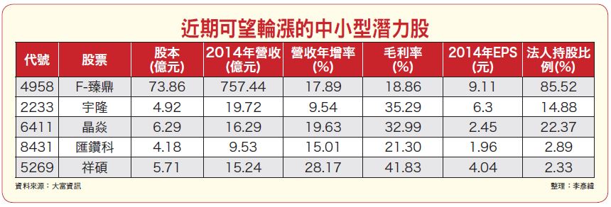 國際股市持續創高,在外資熱錢帶動下,台股萬點行情終於來了。向來為投資人青睞、漲勢最為凌厲的中小型股,後市將接棒強攻、喧賓奪主。在國際股市各主要指數近期相繼創下波段新高,甚至是歷史新高點的帶動下,配合外資法人持續匯入挹注的資金活水推升,搭配政府主管機關不斷釋放出各項有助活絡股市交易、增強股民信心的政策,強力營造利多氣氛,加權指數終於在上周順利越過前波漲勢反壓高點:二○○七年十月的九八五九點,盤中一度攻上萬點大關,這波法人熱錢攻堅的行情欲小不易。不過,可想而知的是,本波大盤指數強勢挑戰萬點上檔反壓的漲升攻勢,主要是目前為市場最大主力─外資,藉由在兩個交易日內花費多達七百多億元新台幣,接連買進盤面大型權值股,發揮「大象推巨木」所拉升而上的大漲行情。中小型股接棒 下波漲升亮點在外資強推台股指數大漲,即將攻上萬點大關後的「後萬點行情」時代,對現階段仍是空手,或是還想進場加碼的投資人而言,接下來要鎖定的標的,必定不會只是外資已經買了不少部位的大型權值股,否則短線豈非成了幫外資抬轎的冤大頭?更何況後市外資是否還要持續買超權值股,也都還是未知數,難保接下來大型股漲勢不會就此戛然而止,甚至出現短線漲多後的回檔修正。所以,台股向來即具有股本小,股性活潑、股價反映利多題材漲升速度快,為投信、主力、實戶所青睞。後市具產業基本面利多拉抬潛力的中小型股,才是「後萬點」時期散戶布局最佳的標的。F-臻鼎緊咬Apple Watch上市利多強勢進擊全球印刷電路板(PCB)軟板市場的F-臻鼎(4958),去(二○一四)年第四季營運成長大幅躍升,挾著傲人的財報數字,強勢稱霸上市櫃印刷電路板產業,掛牌上市三年多以來,首度成功擠下景碩(3189),榮登PCB類股股王寶座。F-臻鼎目前為鴻海集團旗下PCB廠,同時也打入蘋果3C電子產品軟性電路板(FPC)主要供應鏈。日前自結去年與第四季營收、毛利率、稅後淨利、EPS,同創歷史新高,也首次奪得上市櫃PCB族群營收、獲利、股價「三冠王」。F-臻鼎三月營收達五六.七億元,月增率大幅跳增達四五.五九%,年增率也達一四.七九%,與其他兩家台系軟性印刷電路板廠同步創下歷年同期新高,也都同時樂觀預期今年後市營收表現,將很有機會逐季成長且優於去年同期水準,公司經營階層樂觀看待今年營運。預估後市有望因與蘋果先前的合作經驗,持續受惠Apple Watch上市熱銷備貨零組件大利多,以及轉投資中國大陸河北省秦皇島新廠產能,七月可正式投產,下半年營收極有機會逐季成長。市場法人機構多看好F-臻鼎今年可順利賺進一個資本額。中、美車市展望佳 宇隆緊跟BOSCH成長腳步從整體經濟發展情勢與汽車產業市場環境分析看來,美元持續強勢與國際油價繼續下跌,都將有利北美汽車市場銷售量持續成長;中國市場方面,因擴大實施「國四」環保排放限制標準,廣東甚至已提前祭出「國五」標準,受相關環保政策推行下,輸出扭力大、相對油耗省油許多的柴油車款,後市銷售量仍持續看漲,預料BOSCH今年在中國柴油車零組件出貨量,將可順利見到倍增規模。台灣精密金屬加工零件廠宇隆(2233),目前已是BOSCH柴油引擎供油共軌油軌、高壓噴油嘴零件主要供應商,理周投研部預估今年來自BOSCH的訂單量,最多可有三成左右增幅。另一方面,符合中國國四排放標準相關零組件應用規範的汽車零組件廠,尚有Denso、Hilite,均為宇隆在手客戶,未來也將同步挹注宇隆相關合格規範零組件訂單。在大客戶庫存調整已告一段落,今年北美、中國車市後市成長前景展望樂觀、訂單能見度明朗下,宇隆三月營收已重回成長軌道,第一季營收較去年同期增加近一成幅度,單季EPS約一.六七元。宇隆去年全年營收一九.七二億元,年增率九.五四%,創歷史新高紀錄,EPS六.三元。今年營收有望受惠再成長一八%,由一九.七二億元增加至二三.二七億元,第六年改寫歷史新高紀錄;全年EPS至少可達九元以上,甚至不排除有機會挑戰十元。晶焱 受惠USB 3.1 Type-C連接器靜電保護商機根據市調機構統計資料指出,全球二○一四年智慧型手機總出貨量預估為十二億支,年成長率二九.二%;加計平板電腦年度銷量,全年手持式裝置產量上看十五億支以上。如果再依每年約二成增加幅度來計算,預估今年全球手持式裝置出貨量將上看十八億支水準。同時,今年USB 3.1 Type-C市場滲透率推估可大幅拉高至三成,預計全球大約有超過五億顆以上,Type-C連接器搭載巨大商機。在生產Type- C連接器時,均需搭配內建的靜電防護元件(ESD)而言,台股於相關領域布局已久的晶焱(6411),後市可望以其深耕多年、已獲具體成果的「靜電放電保護解決方案」,搭上這一波全球USB 3.1連接器應用風潮所引動的每年約達二百億美元的龐大商機,有機會持續接獲國際行動裝置品牌廠穩定訂單。今年出貨量有望較去年成長達數倍以上,未來營運值得期待。匯鑽科 金屬表面精密電鍍技術專業廠一般精密金屬電鍍利用的「電化學」原理,是一種帶電金屬沉積過程。藉由通電結構所提供的電能,使得內含金屬離子、其他添加物的混合溶液,在陰極、陽極表面進行電化學的「氧化還原」反應,最終把想要產生的金屬離子沉積於目標物件上。電化學反應中,電能驅動溶液中的金屬陽離子,朝陰極移動,透過還原反應,金屬鍍膜即可沉積於物件表面。因此,以電鍍法所形成