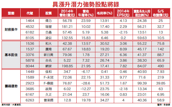 換句話說,這樣的選股策略,往往選出來的標的,大多都不會是股價已見波段漲勢明顯展開的走勢亮眼個股。然而,與偏好挑選股價還未發動漲勢,尚未見到連續數根帶量紅K棒,推升股價已漲升一波的選股邏輯有所不同的,則是另一種選股策略,即是部分市場人士所謂「強者恆強」、「西瓜偎大邊」的操作手法。也就是說,秉持這種選股邏輯的投資人,最後鎖定的標的,往往都是已經創下波段漲勢新高、突破前波漲勢上檔反壓高點,出現連續多道多方跳空缺口,短線持續性價漲量增強勢漲升的亮眼標的。他們大多認為,所挑選出的個股,皆是目前盤面上漲升力道最強、漲勢最亮眼、最具吸睛效應的焦點股,由於這類個股的推升力道最為強勁,後續最有可能持續推高股價,續創波段新高,甚至是歷史高價!也因為強勢漲升型態個股,短線而言最有可能再見到波段回升、反彈漲勢新高,因此而為積極型投資人所青睞,相繼見到壓寶籌碼、卡位的熱絡市況。強勢股型態:財務操作、基本面利多、籌碼優勢能夠支撐股價維持強勢型態的原因,會隨每一檔個股的個別性差異而有所不同。有些個股股價之所以能夠持續走揚,主要是因為產業基本面中長線利多題材,獲得市場買盤認同,在加碼力道源源不絕挹注下,股價自然能持續上漲、屢創新高。也有部分個股由於受惠市場籌碼面集中度較高的優勢,買盤推升力道明顯大於賣盤壓抑效果,短期間股價上揚角度特別陡峭,令人驚豔。另外,有部分公司透過發行「可轉換公司債」(Convertibal Bond; CB,簡稱可轉債),也會間接影響股價的走勢表現。所謂的「可轉換公司債」,乃是企業藉由發行可轉換公司債,提供投資人未來可將所持有的公司債,依照一定轉換比例與轉換價格基準轉換為普通股,享受賣出持股部位、價差獲利的轉換權利,提高進場誘因,達成公司所設定的籌資目標。由於目前金融主管機關已針對企業發行可轉換公司債籌措營運資金,作出相關發行辦法與規範限制,為了符合發行及轉換辦法規定,同時達成原本規劃的籌資金額目標,絕大部分發行可轉換公司債的企業,多會設法將股價在「轉換價格訂定基準日」前,拉抬出一波明顯漲勢,營造出股價後市大有可為,存在轉換價差獲利空間的熱絡氣氛,以獲得投資人青睞,因此會為股價帶來相當程度的拉升效應。發行可轉債 基準日前可見一波拉升以過去的例子來看,自今年初以來,已有:正道(1506)、信錦(1582)、和勤(1586)、旺詮(2437)、正德(2641)、曜亞(4138)、如興(4414)、系統(5309)、志嘉(5529)、國統(8936)等,共計多達三十一家上市櫃公司,申請發行可轉換公司債,其股價表現也多在轉換價格訂定基準日之前見到一波明顯拉抬的漲勢。既然知道發行可轉換公司債的企業,大多會在「轉換價格訂定基準日」前,拉抬一波股價漲勢,投資人自然可以把握這一段黃金時間,提前進場卡位,吃吃公司派拉抬股價的豆腐,搭上漲勢順風車,賺取資本利得。以接下來的時間而言,就有得力(1464)、瑞智(4532)、合晶(6182)、凌巨(8105)等,已完成規劃要發行可轉換公司債,後續拉抬股價、強者恆強的波段漲升行情,值得投資人好好把握。產業基本面展望利多 中長多格局好戲未完此外,目前有多檔個股,由於受惠產業基本面利多題材加持,在外資、投信以及主力、實戶的高認同度買盤進駐下,股價同樣呈現強勢漲升、屢創新高的多頭型態。因為這一類型公司所處的產業,大多是中長線後市營運前景成長可期,營收成長動能令人期待,獲利數字可以推算出來的優質成長性好股,因而普遍受到「有實力」的買盤肯定,股價得以在買盤加碼推升下,呈現連創新高的熱況。而其所憑藉的產業基本面利多發酵題材類型,則各有不同。有來自於成功研發出新產業上市,或是既有產品打入新地域市場,以及接到新客戶、新訂單,還有產品線成功打入新應用市場,更有公司運作新開發成功技術研發出產品獲得客戶肯定,甚至是受惠官方頒布施行新政策及新法令規範,創造出龐大市場商機者。如近期因為擁有獨到的「珍珠鎳金屬電鍍」技術,獲得蘋果(Apple)青睞,成功打入其年度筆電新品MacBook的Type-C接頭連接器電鍍供應鏈,後市更有望接獲蘋果新款iPad,金屬邊框霧面珍珠電鍍技術服務訂單的中國華南地區電鍍專業大廠─匯鑽科(8431),由於未來營收及獲利成長力道令市場高度期待,在買盤持續加碼進駐推升下,其股價表現自掛牌以來,累計最大漲幅已達一三七.七五%!股價目前型態仍為強勢多頭、強者恆強,隨時有可能續創波段新高。目前盤面上與匯鑽科同樣擁有產業基本面利多題材加持,股價也同樣處於高檔震盪整理,隨時有機會衝出盤局、啟動另一波段漲勢的個股,還有和大(1536)、廣隆(1537)、新日興(3376)、台名(5878)、網家(8044)等,未來皆有望受惠基本面利多題材助漲效應,走出令市場刮目相看的波段漲勢,為投資人帶來獲利。特定買盤鎖定籌碼優勢者 漲相尤佳眾所周知,大盤指數及個股漲跌表現,最後是紅K棒收盤上漲或是黑K棒收盤下跌,純粹是買賣雙方,買進與賣出力道的顯現結果所決定。在股市中作多買盤買進力道較強,將所謂的市場浮額籌碼吸納較大部分比例後,股價走勢自然也就會在想要賣出股票的賣方力道偏弱下,順利漲升收紅。換句話說,當一檔個股的流通在外(市場)籌碼,大部分都被有心人(外資、投信、主力、實戶、大股東等)所吸納以後,形成所謂的籌碼鎖住狀