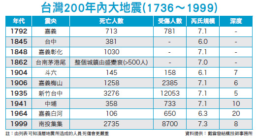 台灣從921大地震後,不時傳出芮氏規模5以上的震度,也讓處於高樓的民眾驚慌;居安思危考量下,除了各種防震建築,民眾也應該要重視建築的「安全履歷」。尼泊爾於今(二○一五)年四月二十五日發生芮氏規模七.九的強震,多處建築物出現大規模損毀,且有十二座世界文化遺產建築倒塌,傷亡人數超過七千多人。在這之前,台灣也在四月二十日早上九點四十九分,於花蓮外海發生規模六.三的地震,天搖地晃的程度讓台北地區民眾非常有感,加上晚上又連續四起有感地震,一天五震,連氣象局都表示不排除還有規模五以上的餘震會發生,令台灣民眾再度喚醒對九二一地震的餘悸。地震陰影 建築安全受重視一九九九年九月二十一日,發生於南投集集的規模七.三地震,共持續一○二秒,總計建物倒塌和損壞的有近十萬餘棟,死亡人數二七三五人,傷一萬多人,無家可歸、流離失所人數初估在二十萬人以上,共計損失達上千億元,對當時整個台灣經濟發展造成重大傷害,而到現在提到九二一大地震,還是餘悸猶存。在地震陰影下,日前卻傳出正值交屋階段的板橋浮洲合宜住宅,在地震過後發現地下室大樑有裂縫事件,雖然承造的日勝生一直強調非結構性問題,但在民意代表介入,加上內政部營建署關注下,迫使日勝生最後承諾,交由第三公正專業單位進行全區結構安全鑑定作業,在未完成鑑定前,將暫緩交屋作業。台灣建築安全履歷協會理事長,同時也是戴雲發結構技師事務所主持結構技師戴雲發指出,在台灣絕大多數的人可能窮畢生之力,才能勉強買下一間房子,讓自己和家人能幸福居住。然而,如何挑選好的安全耐震住宅,卻是專家難尋,漫無頭緒。戴雲發說,台灣因地理環境的關係,大小地震不斷,每一次地震都考驗著建築物對於天然災害的承受度,一旦建築的結構不穩固,小則建物牆壁龜裂,產生漏水等麻煩事情不斷;嚴重一些,鋼筋外露遭受風吹日晒鏽蝕後,勢必影響建物安全。最糟的就像是九二一大地震時,有很多房屋就像積木一樣,倒的倒、塌的塌,有些大樓還硬生生地從中間斷成兩半,或倒向隔壁棟,使其他房屋像骨牌一樣連著遭殃;更誇張的是,有樓上壓扁一樓的,造成二樓直接變一樓的可怕景象,無不令人怵目驚心。「制震設計」及「隔震設計」戴雲發表示,「制震建築」就是在建築物的骨架內,安裝一種或多種的制震元件,用以降低建築物的搖晃程度,以減低來回震動時的不舒適感。制震的好處是可吸收能量、控制搖晃的建築物,降低建築物的變形。在遭遇大地震時,制震器會先發揮功能,不致損及主結構體本身,只要在大地震過後,針對制震器進行檢測,若制震器有所損壞則進行更換。在現今建築發展的趨勢下,有制震器的高樓在未來必定愈來愈普及。「隔震建築」是在建築的基礎層,或以低樓層的某一層當隔震層,並從當層的每根柱子下方裝設隔震設施,藉以吸收地震能量,減少因地震所發生的建築物搖晃,從而提高建築物的安全性。隔震設計在日本神戶大地震時發揮很大的效果,減少許多建築物的損毀。日本特別重視公家單位的建築抗震能力,例如醫院和消防局,以及一些政府單位等,都採用隔震建築,因為在大地震中,急救單位的建築不能損毀,才能救助廣大的傷民。台灣人平均一生會遇到二~三個超強震前內政部長李鴻源曾經表示,台北若發生規模六.三的地震,會有四千棟以上房子倒塌。而在文獻紀錄中,亦明文記載台灣從一七三六年至一九九九年間,共發生十次慘烈的地震(附表)。