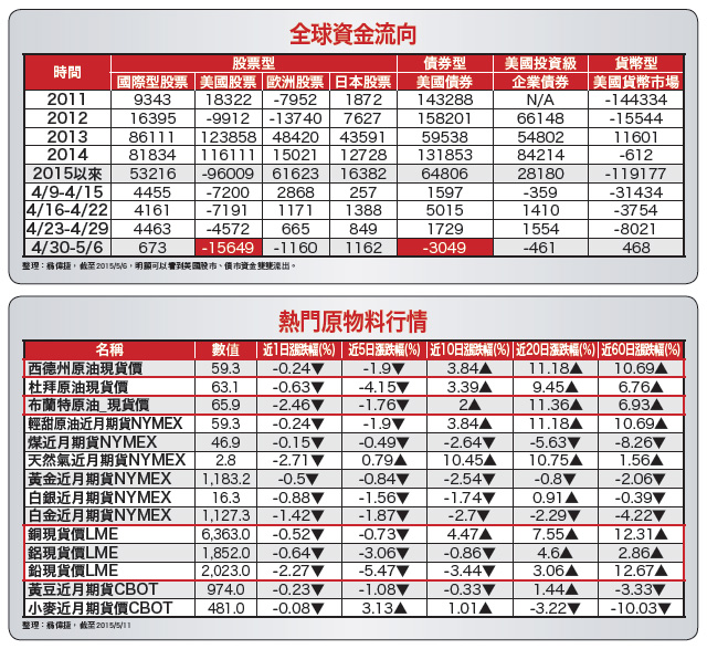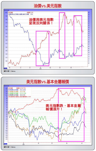 近期國際股市出現些許矛盾現象,主要在於歐美股市出現股、債市齊跌,並且在美元走弱之下,基本金屬也出現急彈。到底這個現象在台北股市中有哪些類股可以受惠呢?近期國際股市出現令人匪夷所思的走勢,再次推翻了一直以來的投資邏輯。在過去兩周裡,歐美股市出現了股、債市雙跌的現象,這與多數時候市場所認知的股債市互補的常態相違背,顯見國際市場步調似乎開始慌了,資金流出股市的同時,也流出債市。在這個時候,大家會習慣去尋找避險標的—黃金,然而貴金屬這次並沒有出現因避險而流入的資金推升報價,到底這個現象要怎麼解釋呢?讓我們先從油價談起。油價彈升反映美元弱勢油價反彈到目前為止,漲幅已經看到五成左右,很多人都在問:「油價難道又要回升到過去動輒每桶八○到一百美元的價格了嗎?」從OPEC主要石油生產國近期公布的數據來看,無論是即將解除經濟制裁的伊朗,還是持續擴大供給量的沙烏地阿拉伯與伊拉克等,都是影響未來油價的主要原因。尤其沙烏地阿拉伯以及伊拉克的持續擴產量,已經達到三十年來的歷史新高,此外以現在原油交易市場來看,從西非、北海到中亞,仍有數千萬桶原油找不到買主,再加上目前每天石油產量仍高於市場需求一百五十萬桶。試問在這般情況下,又如何令接下來的油價再次拱回百元高點呢?所以從市場供需面觀察,眼前仍是供過於求的態勢;至於另一個影響石油價格的因素則是美元。近期美元指數自上回觸及百點大關後,就開始回檔,日前已回到九四至九五附近,所以目前所見到的原油價格上漲,並非為市場供需出現大幅改變,僅是單純反映美元轉趨於弱勢而已。不過站在另外一個角度思考,美元轉弱代表市場對於聯準會今年緊縮美元時程的預期傾向延後,因此市場上資金行情派對料將繼續,按照過去市場資金的慣性,勢必會找尋基期相對在低檔的市場進行投資。全球資金主要流向標的有五大類,分別是房市、股市、匯市、債市以及原物料市場。近期全球股市大漲,並且陸續創下歷史新高,全球投資人有目共睹;然而近兩周股市紛紛開始出現回檔整理的跡象,包括正在實施量化寬鬆的德國、中國與日本等主要經濟體的股市,都出現一波較明顯的拉回。