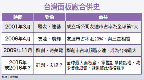 面板市況尚佳 談合併要及早就目前來看,這兩年的面板市況還不差,兩大面板廠皆順利繳出獲利的成績單,要讓雙方坐上談判桌談合併,機率老實說並不高。但是,面板市況不可能一直好,尤其中國的面板廠持續建置大尺寸面板產線,預料今明兩年,中國八點五代面板產線至少有三到四條會完工投產,京東方甚至還喊出要建十點五代線。面對中國大量產能開出,友達跟群創如果仍各持己見,各自打拼,下場恐怕只會比前兩年更不樂觀。「性價比」向來是台灣電子產業得以在世界站穩地位的重要策略,研究機構WitsView資深研究協理邱宇彬表示,這幾年群創跟友達營運狀況較之前大幅好轉,其中一個關鍵,就是面板雙虎找到利基型的面板切割尺寸,避開競爭主流的尺寸市場,或是推出更高階的產品,而採用低價策略;不過,因為低價策略往往「殺敵一萬,自損八千」,並非長久之計。邱宇彬指出,現在友達跟群創的優勢,除了須找到有競爭力的經濟切割尺寸外,現在要觀察的是,包括三星跟中國的面板廠,如京東方、華星光、中電熊貓等,在因應新的八點五代線產能陸續開出後,會不會把終端電視的尺寸向上拉升到五十吋以上。由於友達跟群創目前的利基尺寸是四十到五十吋之間,如果一半被拉大到五十吋以上,面板雙虎的六代線和七點五代線就失去經濟切割的優勢,到時候局勢可能逆轉。另外,隨著中國供應鏈崛起,中國廠商也開始學習性價比,更嚴重的是,中國廠商很多根本就不在意是否會賺錢,因為只要是中國官方支持的重點企業,往往都可以靠著業外補助來美化財務報表,例如中國LED產業中,就有企業是靠銷售煤礦來獲利,打得台灣、日本、韓國等國的LED廠商慘叫連連。台灣面板廠合併的好處,除了資源整合外,最大的優勢是在大量產能的支撐下,終端品牌廠就無法自己決定規格設計,讓面板廠的喊話權大幅提升,不像以前,品牌廠要什麼規格、要多少供貨量,都是品牌廠商說了算。不過仔細觀察,品牌廠的市占率其實並沒有任何一家是獨大的,就算是電視市占率最高的三星,市占率也不過二○%左右;因此,一旦有一家大型面板廠的市占率達近全球四○%,產業的議價權將由品牌廠轉回到面板廠手上,如此一來,面板廠的獲利就能回到正常軌道上,而不會每年都在擔心能不能獲利。