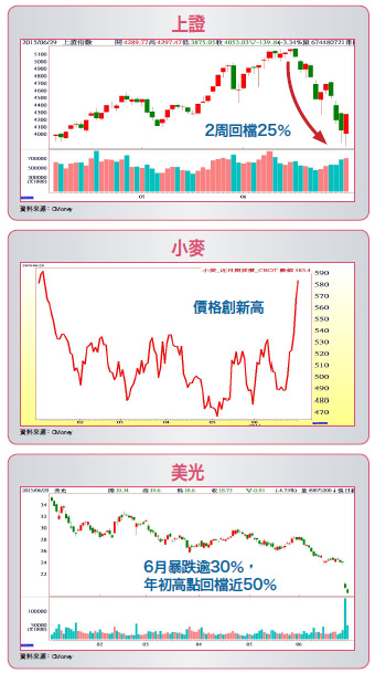 以台股而言,六月份總計大盤高點回檔約五三○點,即五.四%,不過若從今年高點一○○一四點回檔至六月十七日的九一七○點,則已回檔約八%。同一時間美國道瓊指數回檔約二.五%,高科技股則以平盤表現。六月全球股市籠罩在希臘倒債危機下,歐股亦不平靜,泛歐史托克六百指數高低點震盪約六%。不過,最令人震驚的是一路狂漲的陸股,在六月中旬過後大幅回挫,短短兩個星期回檔了二五%,其中代表中小型股的創業板指數更大跌逾三○%,若以機構法人所認定的回檔逾一○%即屬空頭格局,那麼陸股與歐股則已走入空頭,台股、韓股岌岌可危,七月是否成為全球性的空頭?目前看來只剩美股還撐著。聯準會主席葉倫:生技有泡沫疑慮至於其他金融商品,如匯率、油價、金價等,變化不大。值得一提的是,美科技股在六月份一度再寫歷史新高,就內容來看是主漲生技股,NBI生技指數在六月二十三日創下歷史新高後拉回;須留意的是近日華爾街再度示警,去年聯準會主席葉倫提及生技恐有泡沫疑慮,須當謹慎。再者,由於希臘的債務問題也讓全球債市動盪,債券價格急跌,美國債券指標利率(十年期公債殖利率)創下了十個月新高,理論上,債市下跌資金會回流到股市,但近期看來不然,反而有「股債雙殺」的情形。雖然股債出現一片肅殺氣氛,穀物原物料黃豆、玉米、小麥(統稱黃小玉)反而異軍突起,其中小麥價格已創下今年新高。走中長空個股一卡車 太陽能慘跌過去一個月美股科技股表現平平,蘋果(Apple)股價始終在一二五至一三○美元之間盤整;PA射頻股SKYWORKS(SWKS)、AVAGO(AVGO)雖不再創高,但股價仍在高檔;臉書(FB)股價雖創新高,不過與台股連動不高;電動車大廠特斯拉(TESLA)股價六月高點來到二七一元,與歷史新高二九一元僅一步之遙。實際上,上漲的個股已不多,倒是走入中長空的個股卻是一拖拉庫。半導體中的美光科技(MU)股價六月暴跌逾三○%,從今年高點回檔近五○%;英特爾(Intel)也是跌破月線、季線;而與台股連動高的DRAM模組新帝(SNDK)、LED大廠CREE、思科(CSCO)、惠普(HP)、IC封測安可(AMKR),甚至太陽能幾乎全倒,股價可謂慘不忍睹。陸股暴跌泡沫危機?希臘確定倒債,七月五日公投結果?全球股災有一觸即發之勢?七月台股看來動盪難免了。