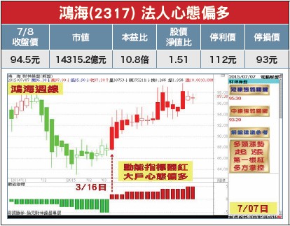 受惠iPhone 6/6 plus熱銷,帶動鴻海(2317)去年EPS繳出八.八五元亮眼成績,再創歷年新高,且首季營運三率三升,EPS達二.○五元,較去年同期大幅成長三七.六%,更令法人驚豔。第二季因蘋果產品進入新舊交替淡季,五月合併營收僅三○一五.九九億元,月減一四.四三%,但仍守穩於三千億元大關之上,年增一二.五五%,並續創歷年新高,預估六月合併營收仍可持穩於三千億元之上,第二季營收再創歷年同期新高可期。隨著iPhone新機種上市日期越來越近,「蘋果熱」將再度加溫,一般而言,八月中下旬起將是相關組裝廠進入大量量產,營運攀抵巔峰大步成長時節,亦是下半年台股衝刺的領先指標。鴻海集團董事長郭台銘於股東會上也不諱言表示,不認同智慧手機需求趨緩的看法,今年鴻海營收仍以不低於一五%成長目標前進,且有信心在獲利上維持去年二二%增幅。加上今年大方配息,三.八元現金股息加一元股票股利,若以七月七日收盤價九七.三元換算,現金殖利率近四%,都有利股價推升。另外,為推動這艘航空母艦大成長,除了擴大物聯網布局,參與法商Actility在物聯網上的合作,加速實現亞太地區智慧城市外,並積極朝電動車、互聯網、中國公共事業、穿戴裝置、感測元件和機器人等五大領域布局。