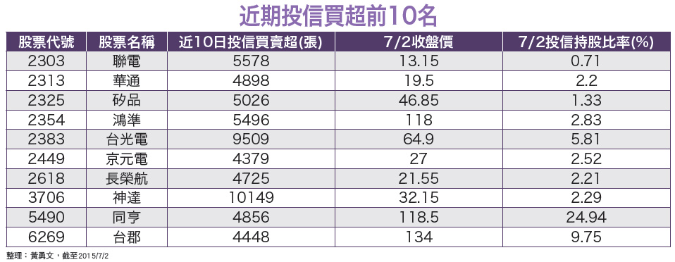 跟上投信作帳行情 享受波段利潤儘管外資持股占台股市值達三五%,具備舉足輕重的影響力,但其持股鎖定的多半是大型龍頭股;相對而言,投信法人對中小型個股的進出,影響力更大。通常投信作帳行情對投資人來說,具有一定程度的參考價值,不妨多加觀察,從中找出機會。投信選股皆從基本面出發,尋找有成長潛力的標的,這和一般投資人選股方式十分類似,同時,投信習慣波段操作,持有個股約在兩個月到半年之間,所以留意投信布局方式,將很有機會找出下一個報酬率高的股票。「作帳行情」堪稱是投信進出股票的一大特色,這是因為每逢季底或是年底,基金經理人操作績效會進行排名,若績效排行前段班,甚至到第一名,就有機會獲得獎勵。為了爭取榮譽,讓操作績效最起碼打敗大盤,投信常常便會發動所謂作帳行情,即把手中持有的股票拉高賣出,或者拉高股價並持有在特定日期,好讓整體績效更加出色。至於如何判斷個股有機會出現作帳行情?通常在大盤多頭期間,股本在三十億以下、股價基期低,且營收、獲利有明顯成長空間的個股,較有機會出現作帳行情。若到了結帳月份,如三、六、九、十二月,投資人不妨觀察當月前幾個交易日,投信買超較多的股票,其中可能就有即將發動作帳行情的個股。至於最後幾個交易日才被投信密集買進的個股,則有可能是下一個季度,投信即將作帳的標的。附表為最近半個月,投信買超前十名排行,提供給讀者參考。庫藏股停看聽 勿急躁出手在個股行情回檔時,公司經常實施庫藏股,將已發行的股票買回,屬於一種安定籌碼的手法。例如金融海嘯期間,曾一度有數百家公司實施庫藏股政策,以挽救劇烈跌勢。雖然庫藏股是公司進場買回自家的股票,經常被外界解讀為利多政策,但此並非毫無缺點,因為會計準則認定,庫藏股是列在股東權益之下,如果公司實施庫藏股以後,股價依然跌跌不休,股東權益就會連帶減少。所以,觀察公司實施庫藏股時,應從股價位於歷史相對的高低點來看。一般而言,應避免買進仍在歷史高價就實施庫藏股的股票,而價位愈低者實施庫藏股,對投資人愈有利。此外,由於庫藏股是以公司帳上資金買進,偶爾可能會有公司「口水護盤」,也就是只宣布實施庫藏股卻沒有實際進場護盤的情況。綜合上述而言,投資人較好的做法,應等待訊號出現,並觀察公開資訊觀測站中,每次公告庫藏股買回的情形,作為確認公司護盤的依據,另外,也要留意公司股價是否止穩、後續獲利是否有轉機,然後再進場,才是較穩當的方式。
