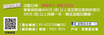 友友自小被賣到了南部,卻像被踢皮球般,一個地方又換過另一個,後來因為被寄養家庭暴力對待後,輾轉回到親生母親身邊。友友原先期待與媽媽共享的親子時光,卻被媽媽的同居男友抹上黑色的夢魘;惡叔叔以恐嚇威脅等手段,對友友長年餵毒與性侵,而媽媽卻睜一隻眼閉一隻眼。直到被學校老師揭開這黑色祕密後,友友才被收容到安置機構。在「慈懷園中途之家」裡,每位孩子都有黑白的過去,遭遇家暴、虐待、不當管教,留在孩子們身上的不是希望,而是一次又一次的傷害;隨之開始自我放棄,漸漸被負向情緒與行為侵蝕。慈懷基金會長期投入迷途兒的安置輔導服務,「慈懷園中途之家」提供全天候生活照顧及心理、情緒、就學、就業等各方面適當的輔導與治療。像是個案友友的狀況,慈懷提供她一個安全的環境與妥善的生活照顧,並安排友友進行心理創傷輔導,在園內學習基本的生活技能,以及人際相處的方法,幫助極度自卑的友友,提升自我的價值感。而這一切的努力,都是為了友友往後自立的準備。關於募款計劃慈懷基金會預計籌募250萬元,針對孩子們「生理、心理、學業」三方面,提供專業的處遇,幫助迷途兒填補對家的缺憾、建立自我正向能力,讓孩子揮別黑白過去,為青春人生上色。捐款滿額贈孩子們的改變需要時間、需要毅力,更需要您的支持!一份心力就是無限的希望,即日起至12月底止,凡單筆捐款滿3600元以上,或是每月捐款300元(滿一年),即可獲贈溫暖回饋禮。愛心專線:03-9231208轉262,活動網址:http://www.tzhu.org.tw/wwwupload/event/,或上網搜尋「慈懷基金會」。