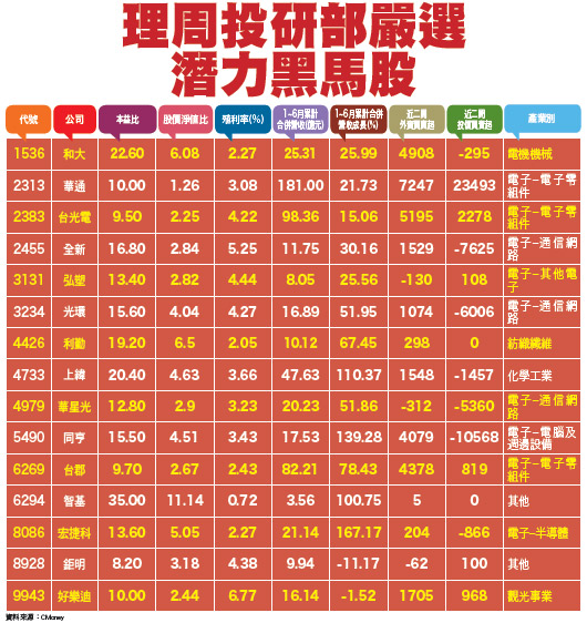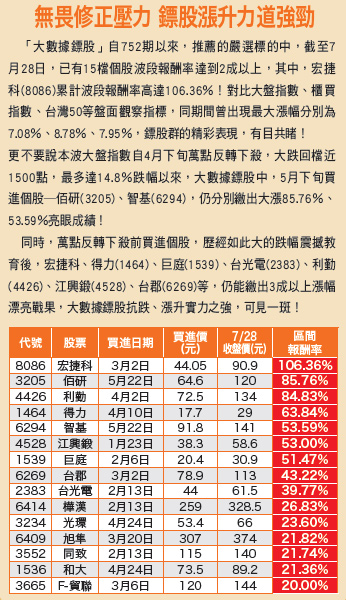 本周推薦鏢股和大、華通、台光電、利勤、上緯、台郡、宏捷科、好樂迪等,產業前景展望透明度高、營收業績成長動能強,適合偏多操作。大盤指數本波自四月下旬萬點反轉修正、大幅回檔以來,最深下跌至八五三二點,累計近一五○○點跌點,高達一五%左右跌幅,跌勢不可謂不重,空方追擊、多頭潰敗,盤面一片哀鴻遍野。法人忙著寫檢討報告,投資人因融資追繳、斷頭壓力而忙著殺出持股,多方無心戀戰下,大盤指數不斷往下探底,接連跌破九五○○、九○○○點、八七五○點三道重要關卡,目前還找不到夠力的下檔鐵板支撐。相對弱勢大盤 大數據鏢股表現仍然突出但這是台股整體盤勢,以及除大數據鏢股群以外,其他個股的弱勢表現,以鏢股族群於同一期間內的表現而言,孰優孰劣,答案再清楚不過。歷經六月、七月下旬,接連兩波跌幅更重的下殺跌勢後,鏢股族群的股價像未曾受到拖累般,既有的漲升格局還是一樣強勢。因此,讀者手中若持有大數據鏢股,如:宏捷科、佰研、利勤、得力、智基等,這一波大幅回檔修正跌勢與各位又有何干呢?相較市場上其他盲目選股,導致近期如同坐了好幾趟台股大怒神的投資人,相信應該都感到安心許多。本周理周投研部精選鏢股族群,不乏有財報表現優異,法人已進場卡位反彈行情、領先布局者,後市也可望因基本面佳、旺季時節已屆、前景展望透明度高、營收獲利成長確定性高,有機會走出長線彈升漲勢,如:和大(1536)、華通(2313)、台光電(2383)、利勤(4426)、上緯(4733)、台郡(6269)、宏捷科(8086)、好樂迪(9943)等。其中,本益比仍處合理區間,適合偏多操作標的有:利勤、上緯、台郡等。利勤、上緯、台郡 財報優等生利勤(4426):累計一~六月營收年增率高達六七.四五%。二○一四年巴西世足賽,蟄伏多年的台灣紡織業機能性、運動休閒業者營運大幅加溫,運動鞋材生產廠利勤表現亮眼,年度營收較年成長約一五.五八%,稅後淨利年增率約三七.九五%,全年EPS三.五一元。利勤今年營運策略以立體織物為主,除了積極拓展全球市場行銷據點,也將配合上下游合作廠商,持續開發新產品、新客戶、協力發展新業務,持續提高市占率。預估隨二○一六年巴西奧運題材熱身下,不只營收將逐步增溫,股價也可望重啟波段漲勢。上緯(4733):環保耐蝕樹脂專業廠,因中國風力發電裝機需求持續暢旺,推升第二季營收創歷史新高;一~六月累計營收四七.六三億元,年增率高達一一○.三七%。另外,第三季上緯還可再認列經濟部對苗栗離岸風場案補助款,獲利表現再加分。雖然上緯與中國風電業龍頭廠「金風」合資的江蘇新廠,投產時間由原本預定的下半年延至明年第一季,但不會影響接下來的出貨表現。上緯指出,中國下半年風電市場需求仍旺,配合新客戶、新產品營收挹注動能逐步增強,有望繼續穩定成長。台郡(6269):軟式印刷電路板大廠,公布第二季合併營收四一.九一億元,年增率九九.九%,合併毛利率二八.三%,稅後盈餘年增率高達一三九五.八%,為歷年同期新高!單季EPS一.五元。台郡累計上半年合併營收八二.二一億元,年增率高達七八.四三%,稅後盈餘年增率則高達四一四.九%,上半年EPS達四.七八元。公司預估第三季營運表現會比第二季好,單季產值可較去年同期增加五○%以上,第四季更將進入全年營運高峰。預估下半年新產品組合將較往年好,毛利率明顯提升下,整體獲利表現勢必優於往年。