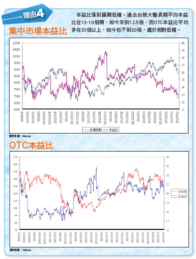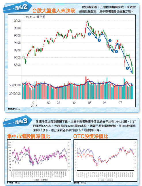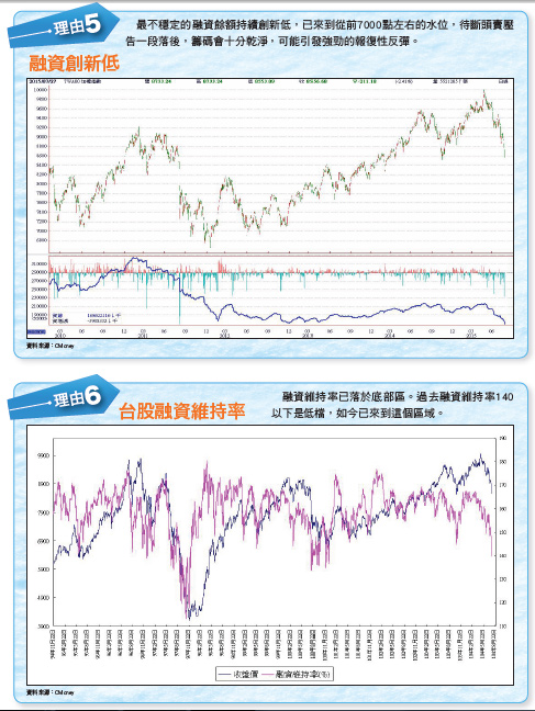 環顧全球 台股獨弱台股相對全球其他股市顯得非常弱勢,國際股市震盪整理,而台股大盤卻有加速探底之現象,惟從急跌走勢中,已經出現末跌段的現象。自萬點以來,以技術分析的波浪理論而言,現階段位置正處於第五波的末跌段。末跌段的跌勢往往最為兇猛、幅度也最大,但是確認了末跌段後,指數要修正到哪裡才能止跌?從股價淨值比、本益比、融資等角度看,可以更清楚。台股的股價淨值比排除掉二○○八年金融海嘯期間的近五年而言,可發現上下緣區間平均落在一.五倍至一.九倍之間,二○一一年台股回測至六六○九點,當時的股價淨值比為一.四六倍,截至今年七月二十七日加權指數位置為八五五六點時,股價淨值比為一.五一倍,已經來到近年來低點位置。而台股本益比亦同,在排除掉二○○八年金融海嘯期間的近五年而言,上下緣區間平均落在十二.五倍至十七倍之間。截至今年七月二十七日,加權指數位置為八五五六點時,本益比為十二.五倍,也已經創下近年來新低的評價水位。