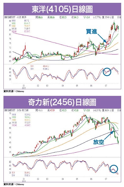 利用KD指標決定買賣時機如果說月線和季線是判斷股價方向的依據,那麼KD指標就是用來選擇買賣股票的時機。KD指標又叫「隨機指標」,其最主要的假設是股票位於上漲波段時,收盤價會往當日價格波動的最高價收斂,而當股價位於下跌段時,收盤價會朝向當日價格波動的最低價收斂。一般而言,我們會以五○作為KD指標的基本線,當KD大於五○,代表股價屬於多方趨勢;相反地,一旦KD低於五○,股價即屬空方趨勢。KD指標由於涵蓋了一定時間內最高價與最低價的概念,所以可以很靈敏地反映出股價變化,但也因為過於靈敏,所以只適合作短線指標,並且建議不要單獨使用。一個簡單且有效的方法,就是順著長線趨勢操作,長線多頭、低檔黃金交叉時作多,長線空頭、高檔死亡交叉時作空。以下以兩檔股票來說明:東洋(4105)在七月二日的收盤價為七十六元,當時為上漲格局,此時KD指標剛好黃金交叉,顯然屬於多頭起漲行情,漲到七月十七日,最高為九○.五元,隔天KD指標死亡交叉,便可將股票獲利賣出,這是作多的應用。又例如奇力新(2456)在七月十七日的收盤價為五五.六元,均線已呈死亡交叉,且KD指標也是死亡交叉,代表是一個好空點,可以放空操作,等KD黃金交叉回補即可。
