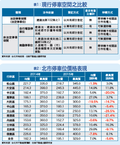 台北市車位價格漲跌不一住商企研室整理了二○一四年與二○一五年「獨立車位(可對不銷售)」價格後發現,整體來說,北市停車位均價約有七%的漲幅,其中萬華、北投漲最多,漲幅都超過兩成,但信義與大同不漲反跌,分別下滑七.八%及一九.五%(表二)。徐佳馨表示,整體房市下修,但各行政區的停車位價格卻各自表述,關鍵應在於供需。以信義區為例,政府興建大量公有停車空間,停車便利提高,民眾自然願意以租代買,也讓漫天喊價者沒有獲取暴利的空間。另從資料來看,北市停車位總價都在百萬之譜,但相對房價都上千萬元以上,停車位因為總價低,過去有不少人以投資停車空間為業,賺取租金收益。至於在各行政區表現上,停車空間少、價格較低的萬華與北投,漲幅最為驚人,尤其北投漲幅更高達二九.八%。徐佳馨說,車位價格低,容易出現驚人漲幅,加上舊市區對車位需求大,在一位難求的狀況下,自然能有所表現。她進一步表示,停車位行情理論上應該會因為供需關係而出現價漲,不過多數獨立車位由於銀行不貸款,所以現金壓力不小,此外,當車位價格超過車主所能忍受的範圍,車主寧可去找更便宜的停車方案,甚至以租代買,或是採取其他方式代步,不會給賣方獅子大開口的機會。停車位擁三優點雖然現階段租車位便宜,很多民眾還是喜歡購置車位。徐佳馨分析,加買車位最大優勢在於便利,回家不用找車位,且能享受未來增值,況且有了車位賣相好,轉手性也佳。另外她也認為,停車位優點有三:一、出租容易:只要選擇產權清楚的停車位,不論是在辦公大樓、住宅區、商圈周邊,都能夠輕鬆出租。二、收益高:以約莫都會周邊的小套房價格,便可坐領六~八%的固定收益。三、免裝潢費:停車位不需要裝潢費的特性,是目前之所以受到青睞的重要原因。對於想要投資停車位的人,則必須仔細計算停車位的投資報酬率。徐佳馨指出,報酬率約在五~八%之間較為合理,但除了投資報酬率之外,還要考慮周邊需求,避免找到投報率高,但出租率不高的地雷區。全國不動產企研室主任張?勻分析,由於大多數新成屋附有停車場,因此若柯P新政策上路,新成屋受衝擊最小;但台北市大多數是沒有停車位的公寓及華廈,很可能會受到衝擊,並帶動停車位投資。