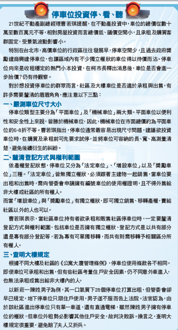 停車位投資也要實價登錄張?勻表示,若台北市要推此新政,必須得有配套措施,在台北市較欠缺停車位的老舊公寓密集住宅區,設立大量公有停車場,否則將會推升停車位售價和停車場租金,造成台北市M型化市場更加顯著。當然,上有政策下有對策,車主為了買車,將戶籍遷往外縣市也不無可能,未來該車若有罰單、牌照稅,其收入將外流其他縣市。另外,買賣停車位跟買賣房子一樣,都一樣要實價登錄,且照樣會有稅負問題。張?勻指出,若是可以獨立買賣的停車位交易稅負,與房屋買賣相同,同樣有財產交易所得稅、土地增值稅;若持有未滿二年出售,則將課徵奢侈稅。至於明年房地合一上路後,則依取得時間而定,出售時,以成交價減掉房地取得的成本及費用,將以五~四五%稅率課徵!