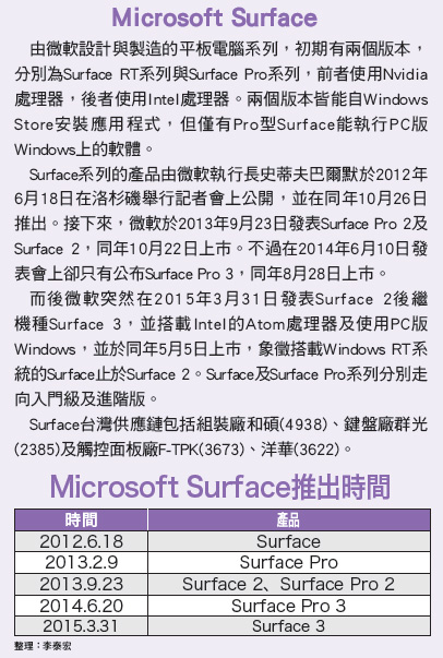 熬過初期虧損 Surface未來發展樂觀時至今日,目前市面上的二合一產品已相當眾多,英特爾(Intel)還特別針對不同筆電品牌廠推出的二合一產品做了三種分類,包括Ultrabook(超極緻筆電)二合一裝置、可拆卸式二合一裝置以及可變形二合一裝置。Ultrabook是英特爾之前積極推動的超輕薄筆電,就是鎖定蘋果的MacBook Air為假想敵,因此是以輕薄又兼具效能為訴求,英特爾也定義Ultrabook二合一裝置,就是兼具極致的運算效能和優異的電池續航力,而且可以迅速從平板電腦模式切換到筆記型電腦模式。至於可拆卸式二合一裝置,顧名思義,就是只要裝上鍵盤,平板電腦也可以馬上變成可輕鬆使用的筆記型電腦。而可變形二合一裝置,則是維持原本筆電的使用習慣,把筆電定位為數位生活的輔助工具,當然偶爾也要休閒一下,只要將螢幕翻轉,即可變身平板電腦享受盡興玩樂。而微軟的Surface,就是屬於第三種定義,也就是可變形二合一裝置。微軟現任執行長Satya Nadella在二○一四年二月上任後,仍持續堅持Surface平板電腦業務,在差異化的策略下,Surface終於度過初期的虧損與庫存問題,最新一季Surface相關業務的營收來到八.八八億美元,年增率達到一一七%,而在二○一五年會計年度(二○一四年七月到二○一五年六月),營收達到三十六億美元規模,也讓Nadella對於Surface發展相當樂觀。