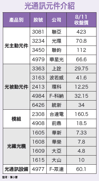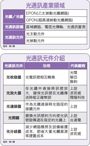 三網融合不可或缺的要角光通訊的原理,是利用光線透過光纖、光波導等應用,把距離很遠的電腦在短時間連結,相互傳輸消息。光速每秒高達三十萬公里,比起聲波或電子傳輸,光通訊都快上許多。 光纖通訊相對電纜與微波而言,具有長距離通信、節省管道空間、極大通信頻寬、節省經營成本、不受電磁波干擾,以及保密性高等優點,相當適合軍事、銀行連線和電腦網路。 光纖通訊系統從一九八○年開始,就對全球電信工業產生革命性的影響,逐漸取代過去傳統的銅線傳輸,並演進成傳輸速度為100 Gb/s的寬頻通信技術。 現代的光纖通訊技術,多利用發光二極體(LED)與雷射二極體(laser diode)進行光傳輸,發送方輸入的數位訊號,透過發射器轉換為光訊號,再透過光纖遠距離傳遞後,經光放大器等中繼器,傳導至接受器後再轉回數位訊號,數秒之間即完成大量資料傳輸。 基於前述的基本特性與技術,加上行動網路時代的來臨,線上影音娛樂需求大盛,網路頻寬需求持續爆發,包括Google、Facebook、阿里巴巴等網路服務業者皆加速建置大型資料中心(Data Center),同時加速升級骨幹網路,提高了光通訊產業的需求。 現在主流的4G行動上網,光通訊產業同樣直接受惠。4G會透過光纖網路與微型基站來延伸網路訊號發射的據點,達到大型基地台的網路覆蓋訊號效果,等於電信業者不需要大量布建基地台,光通訊便可節省大型基地台成本,同時達成高密度的覆蓋網路效能。換句話說,光通訊產業因此成為中國電信、廣電、網路「三網融合」願景的重要角色。 台灣光通訊產業以元件為主光電科技工業協進會(PIDA)表示,全球光通訊產業經歷二○○○年的泡沫化後,持續四到五年的低迷、整合、淘汰、合併,直到二○○六年才逐漸穩定,慢慢步上重整後的軌道,並於二○一○年終於看到較大幅度的成長。近年受惠各大網路平台的興起、網路使用者對頻寬的需求等,促使各國積極投入光纖寬頻網路的基礎建設。 整個光通訊產業,主要由光纖/光纜、光通訊設備及光通訊元件等三大領域組成。光纖有兩大技術:EPON(乙太被動光纖網路)與GPON(超高速被動光纖網路);光通訊設備如區域網路設備、電信光傳輸設備、光通訊量測設備等;光通訊元件則可粗略分為光主動元件與光被動元件,包括光收發器、光放大器、光連接器、光開關及光分歧器等。 光通訊主動元件與被動元件的差別,在於主動元件涉及光電轉換與光訊號放大,為「承先啟後」的重要角色;而被動元件本身無法產生光電轉換,乃針對光訊號做接續、分歧、濾波、衰減或隔離,包括連接器、耦合器、分波多工器、濾波器、隔離器等。 台灣為人熟知的,有:華星光(4979)、光環(3234)與聯鈞(3450);光被動元件廠,如:波若威(3163)。產業人士指出,光主動元件在產業的主導性,較光被動元件業者高,而且光被動元件競爭激烈,使得毛利率大幅下滑,多數業者不願把重心擺在中國市場,換句話說,受惠於光通訊產業成長商機的程度也較低。