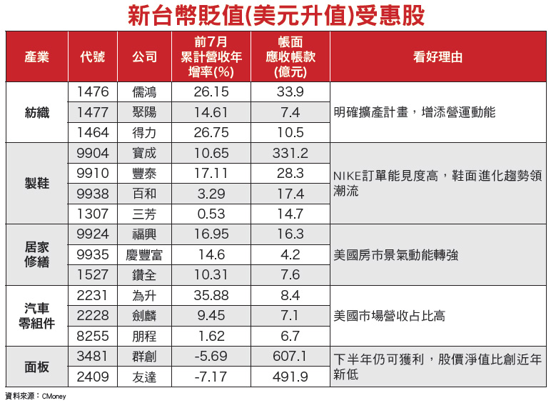 美國復甦概念股「錦上添花」由於台幣貶值趨勢已可預期,後續衍生出來的受惠股及受害股,自然就會在盤面提早反映,像是「美國復甦概念股」,產品幾乎都是美元報價,可望享有美元升值及台幣貶值的雙重好處。隨著美元逐步走強,美國民眾實質購買力將隨之增強,對進口品需求也就跟著增加,國內以美國為主要市場的出口商,將會是此趨勢下的受惠者,成為推升股價向上的重要力量。觀察主計處所公布的七月海關進出口貿易統計速報,國內對主要出口國家出口金額變化,七月僅剩下美國市場是較去年同期成長,其餘國家都是衰退;累計前七月也只有日本及美國還能保住成長的表現,隱含主要出口這兩個市場的公司,營運狀況應較為穩定。在目前產業景氣不明的階段,相關個股就容易變成資金避風港,正是「美國復甦概念股」為何近期股價能夠逆勢抗跌的原因。奧運備貨潮 紡織、製鞋營運迎高峰其中,產業進入傳統旺季的紡織、製鞋股,客戶多為歐美運動品牌客戶,不僅搭上近年興起的運動休閒風潮,為因應客戶對明年奧運的備貨潮,下半年本來將達到近年營運高峰,如今又遇上台幣貶值,對於營收及獲利將會有加分效果,可算是「錦上添花」最佳代表股。以紡織股王儒鴻(1476),訂單是以美元計價,且接單多是在六至八個月前,預期台幣貶值帶來的效果至少可以維持到年底。投資人可留意強勢指標儒鴻及聚陽(1477),若近日能有效突破反壓創高,類股應有機會出現一波比價效應。但要提醒注意的是,跨太平洋夥伴關係協議(TPP)未來若不幸破局,恐變成此類股本益比下修的潛在風險。受惠就業市場回溫,房貸利率維持低檔及住宅需求增加等因素,美國六月份成屋銷售改寫八年來新高,比上個月揚升三.二個百分點。近年中國買家已躍升市場主要買盤力量,過去數年來中國非法資金外逃年逾千億美元,鎖定轉進的重要標的就是美國房市。美國房市數據佳 Home Depot概念股具「漲」相目前更低的人民幣匯率預期,勢必會引發中國人試圖在進一步貶值前,就把資金抽離中國,美國房市的潛在需求就有再提升的空間。因此,以Home Depot概念股為主房屋修繕族群,也是投資人可以留意的族群。Home Depot概念股之一的氣動工具代工廠鑽全(1527),因手上擁有巨額美元資產,貨幣性資產二.三四億美元、非貨幣資產達一.四三億美元,隨台幣升貶將產生金額不小的匯兌損益,去年全年匯兌收益就高達近五億元,上半年則約有二.五億元匯損,預期在台幣已貶破去年低點下,下半年財報應可見到可觀的匯兌收益。另因第三季為鑽全整年最旺的一季,台幣貶值效益對營運來說,也是「錦上添花」。