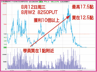 由於選擇權具有時間價值,因此不適合每天進場。當行情波動較大時,才會有較大的獲利空間。筆者在課堂上時常教導學員「不要看到黑影就開槍」,在出手前要謹慎。八月十一日中國央行將人民幣的中間價大幅下調,當晚歐美股市重挫,因為市場擔心貨幣戰爭開打。翌日,同時也是八月第二周選擇權的結算日,市場擔心壽險公司的人民幣資產會有大幅度的匯損,當天富邦金及國泰金盤中最高重挫約九%,早盤台股大跌逾百點以上。筆者今年第一季的選擇權學員,頗能掌握筆者在課堂上傳授的精髓,當時買進當天結算的八二五○點賣權,買進成本在一點左右,共買進一百口。隨著台股當天的大跌,八二五○點賣權的權利金由一點大幅上漲至一七.五點,該學員在一二.五點獲利平倉,當天獲利十倍以上。這就是筆者獨創的「神奇一二三操盤法」,也就是愈靠近周三的結算日,選擇權的風險和利潤空間同步放大。特別是出現「黑天鵝」事件時,就是扣下扳機的最佳時刻。該學員買進價外的選擇權一百口,其實權利金成本只有五千元,就算失敗了損失也有限。該學員當天獲利十倍以上,充分發揮了選擇權「風險有限,獲利無限」的精神。近期台股波動幅度很大,選擇權動輒出現一天數十倍的獲利機會,若看錯方向也不用擔心補繳保證金,想要反敗為勝的投資人,選擇權是非常好的金融工具。