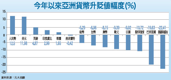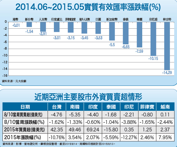 人民幣波動短空長多人民幣無預警大貶也連帶影響整體亞洲新興市場,擔憂貨幣戰爭一觸即發。外資除連二周微幅敲進越南○.一一億美元外,其餘主要亞股均遭調節。其中,南韓股市賣壓最重,遭外資一舉賣超五.三五億美元,為近三周最大賣超;至於同樣倚賴出口的台股和印度股市也分別被調節四.七六億美元和四.四億美元。摩根投信認為,若人民幣匯價能逐漸回穩,當有利亞股後續資金動能。摩根中國雙息平衡基金經理人余鎮文指出,人行弱化人民幣盯住美元的程度,預期未來人民幣兌美元匯率的波動幅度加大,進一步增強人民幣波動性,更能符合市場供需機制,搭配國際貨幣基金組織(IMF)肯定人行引導人民幣貼近市場匯率,將有助於人民幣國際化。再者,今年以來人民幣相對於全球主要貨幣表現強勢,導致貿易數據大幅低於預期。余鎮文表示,為了挽救低迷的出口,人行不惜放手讓人民幣貶值,也是變相的寬鬆措施,進一步強化中國官方對經濟增速的支持力度,後續要關注的是中國需求是否獲得提振。短線來看,人民幣匯率中間價調整後,市場仍需一段時間的適應與磨合。余鎮文認為,人行將密切監測市場,穩定市場預期,下半年人民幣仍有小幅貶值的空間,但匯率將維持穩定,不致形成連續貶值的態勢。復華人民幣貨幣市場基金經理人林國揚表示,人民幣短期波動幅度因官方出手而加大,使離岸人民幣也因反映市場預期心理,測試在六.四~六.五元價位,但隨境內人民幣匯率止穩,離岸人民幣也將跟隨境內匯率走勢。中期而言,在一次性貶值滿足後,匯率將回穩,波動會稍微放大;長期來看,人民幣將逐步走向管理浮動匯率的制度。傾中苦果 台灣名列麻煩十國國泰投信認為,人民幣大貶對全球股市主要影響有以下四點:一、在中國設據點或銷售產品的跨國企業,財報將因匯率轉換而受到部分匯損傷害,但預期單純匯率轉換對財報數字的影響,在一個季度內可大部分反應完畢。二、原本市場已預期中國需求疲弱,此時人民幣貶值,部分應證市場對中國需求疲弱的想法,衝擊原炒作中國概念的高估值消費類股,故投資人選股上應避開這類股票。三、亞洲各國出口互有競爭關係,若人民幣貶較多,將衝擊較有替代性的產業或國家,造成亞洲股市內部此消彼漲。四、人民幣匯率適度貶值,有利中國第三季經濟,成長率保七機率提高,基本面持續改善有利陸股緩步走揚。在中國放手讓人民幣貶值後,摩根士丹利(大摩)以「麻煩十國」(Troubled Ten)來形容新台幣、韓元及星幣等十國貨幣所面臨的風險最大。其他名列「麻煩十國」的貨幣還包括南非蘭德、巴西里爾、泰銖、智利披索、哥倫比亞披索、秘魯索爾及俄羅斯盧布。理由是這十個國家與中國貿易往來密切或存在競爭關係,因此在人民幣貶值後面臨的風險特別高,市場對這些貨幣尤其擔憂。新興亞洲與中國貿易依存度較高,人民幣貶值造成消費力下滑勢必不利亞洲鄰近國家。摩根亞太入息基金經理人羅傑瑞分析,南韓和台灣出口高度倚賴中國市場,出口至中國占國家GDP比重約四.五%~五%,而東協各國出口至中國占國加GDP比重均超過一%,市場憂心人民幣持續貶值將抑制其對進口品的需求,伴隨其他貨幣也對美元走弱,拉抬全球經濟通縮可能性,也牽連新興亞洲股匯市短線震盪。不過他也認為,市場解讀人民幣貶值是中國官方刺激出口的政策利多之一,未來若觀察中國經濟數據轉好、貨幣趨穩,加上全球景氣持續復甦,將會帶動出口改善,新興亞洲中長期經濟可望受惠中國經濟走穩。