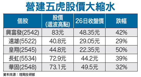 台北市鄭先生問:股市從萬點行情到破8000點大關,連帶地營建類股也跌得鼻青臉腫,「營建五虎」的股價讓人不忍卒睹,是否也代表著房市會越走越差呢?答:根據證券分析師對行情的分析,台股在今(2015)年4月27日衝上萬點,指數來到了10014.28點,沒想到才4個月時間,8月21日指數卻摜破十年線,24日盤中更大跌583點,而26日收7715.59點,足足跌了2300點,而股價總市值也從4月24日28兆7837.58億元驟降至8月25日之22兆4005.16億元(可得知數字),短短4個月之間足足蒸發了6兆3832億元,占今年GDP16.77兆元之38.06%,而股市散戶更是哀鴻遍野。千萬不要小看了「6兆元」,試看,今年我國的GDP預估值為16.77兆元,台灣股市在短短4個月內蒸發掉6兆餘元,等同於我國GDP驟減超過1/3,這對民間消費與經濟發展絕對是很大的傷害。股市跌跌不休,營建類股自然無法置身於事外,其中「營建五虎」的股價也跌了29%~50%成(見附表),尤其興富發(2542)股價更從8字頭跌至4字頭,至於皇翔(2545)股價則腰斬,都讓投資者的心在滴血!營建類股股價表現,跟著大盤向下探底,最主要的因素還是在於政府打房的各項措施,其中尤以奢侈稅、信用管制調降房貸成數、提高房屋稅、豪宅稅及2016年1月1日將上路的房地合一稅等為主要,這一連串接踵而來的重稅,令房市不急凍也難。台灣房屋近幾年的移轉棟數,分別是2011年的36.17萬棟、2012年的32.89萬棟,2013年的37.19萬棟及2014年的32.06萬棟;而今年上半年只有13.5萬棟,依此推估,全年可能只剩下25~26萬棟。房屋移轉棟數的下降,代表著建商的預售屋或新成屋市場更難去化。今年以來,不少中小型建商不斷向我詢問:「房市的未來走向如何?」而他們普遍提及最近的隱憂,竟是「客戶不來交屋,該怎麼辦?」他們談到,客戶不來交屋,雖然可以依約收取違約金,但在房市景氣逐漸走跌情況下,該戶房屋未來的售價一定比當初預售時還低,萬一賣不出去,就會變成「餘屋」,將來要繳的房屋稅、地價稅,一項都不能少,反而會變成建商的「持有成本」,得不償失。更可怕的是,若大多數的客戶都不來「交屋」,則房市未來的「骨牌效應」將難以想像,因此,「營建五虎」股價連番下挫,除反映大盤行情外,也透露出營收的未來隱憂。過去「營建五虎」的營收表現一向都很好,每股獲利常是年賺一個股本(EPS達10元)以上;但從2014年房市出現反轉後,營建類股的好光景即呈現每況愈下之不利情勢。最近股價下跌無法止血,也在於提前反映今年的營收與獲利表現。只是,股市、房市一向被視為經濟發展的支柱產業,如今雙雙出現重挫局面,勢必更不利未來的經濟發展。雖然政府打房主要係抑制飆漲的房價,希望實現「居住正義」,但力道過急、過猛,並非良策,尤其房屋稅同步大幅調高「稅基」和「稅率」,重稅更成為壓垮房市的最後一根稻草。現階段我們仍不知政府是否意識到打房手法過於激烈,已帶來層層隱憂,縱然中央銀行於8月13日召開常務理事會議後,宣布放寬不動產信用管制措施,恐亦無法拯救急轉直下的頹勢。此次放寬不動產信用管制措施,在特定管制地區刪除新北市八里、鶯歌區及桃園、中壢、龜山及蘆竹等4區,同時,豪宅、法人購置住宅和第3戶房貸的最高成數,也由5成提高至6成。央行的該項放寬管制雖是即日起生效,但房市究竟會回以怎麼樣的反應呢?等到9月初六都買賣移轉棟數,或9月下旬內政部的統計數據公布,謎底即可揭曉。