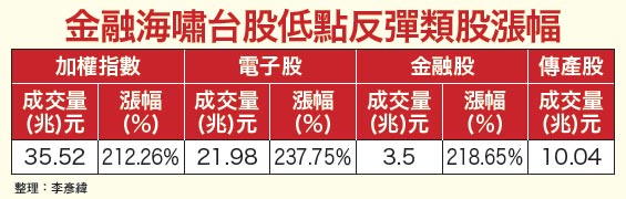 政策面、亞洲盃加持 金融股扮反攻頭號戰將七年前金融海嘯發生後,當時台股出現一大波彈升上漲走勢,順利將大盤指數自三九五五點推升至八千點以上,領頭反攻的主力部隊,即為電子、金融。從統計資料即可清楚發現,電子、金融的波段漲幅雙雙領先大盤,反彈期間,電子股二十一.九八兆的成交金額,亦占台股整體比重高達六一.八八%。電子、金融扮演台股未來反彈波段主攻部隊角色的重要性,已不言可喻。自金管會主委曾銘宗正式宣布,八月底立法院會期開始前,率領國內由金控、銀行、票券、證券、產險、壽險各家業者組成的龐大訪問團,前進東南亞,進行亞洲盃賽前會「開路造橋」之旅後,多檔金融股股價即見明顯漲勢,更不乏點火波段漲升行情者,對比同時期委靡不振的大盤走勢,令人驚豔。雖然近期金融族群也因為台股整體表現欠佳、持續回檔探底,市場氣氛轉趨悲觀,跟著大幅回檔修正,卻並未如同大盤跌破「十年線」,類股指數依舊強勢守穩於十年線之上。隨著執政黨必須表態救市的最後期限日漸逼近,預料所有類股族群中,最有機會獲得政策執行面利多效應加持,向來即為官方護盤鎖定標的的金融股,必定不會於本波大波段反彈漲勢中缺席。